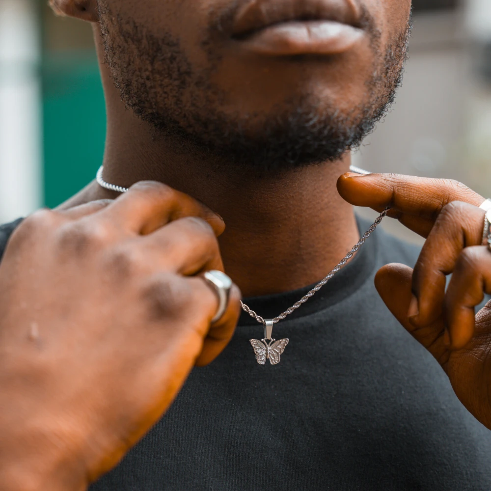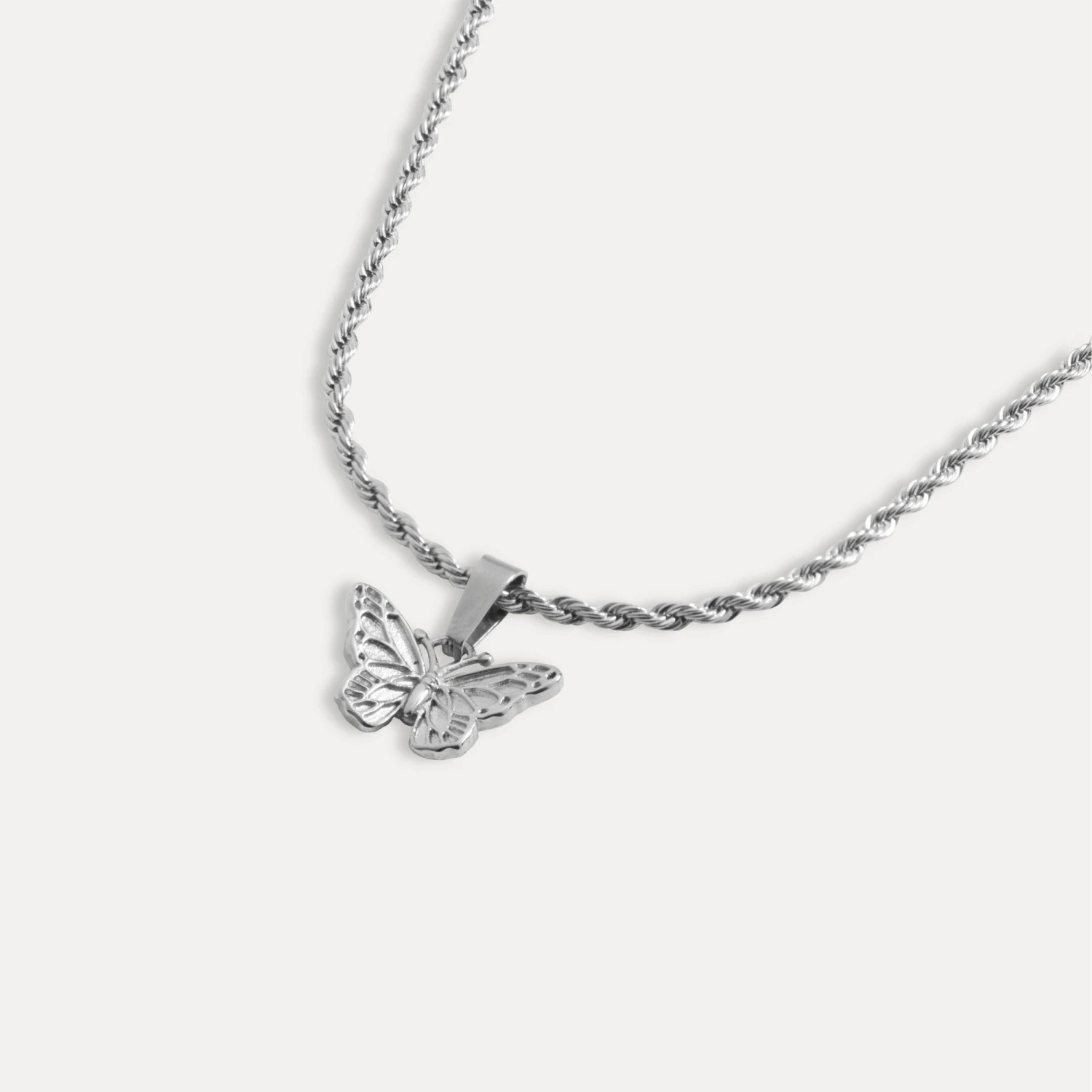 Featuring a detailed silver Butterfly pendant combined with a strong silver Rope chain. The small pendant pairs perfectly with other pendants and chunkier chains.