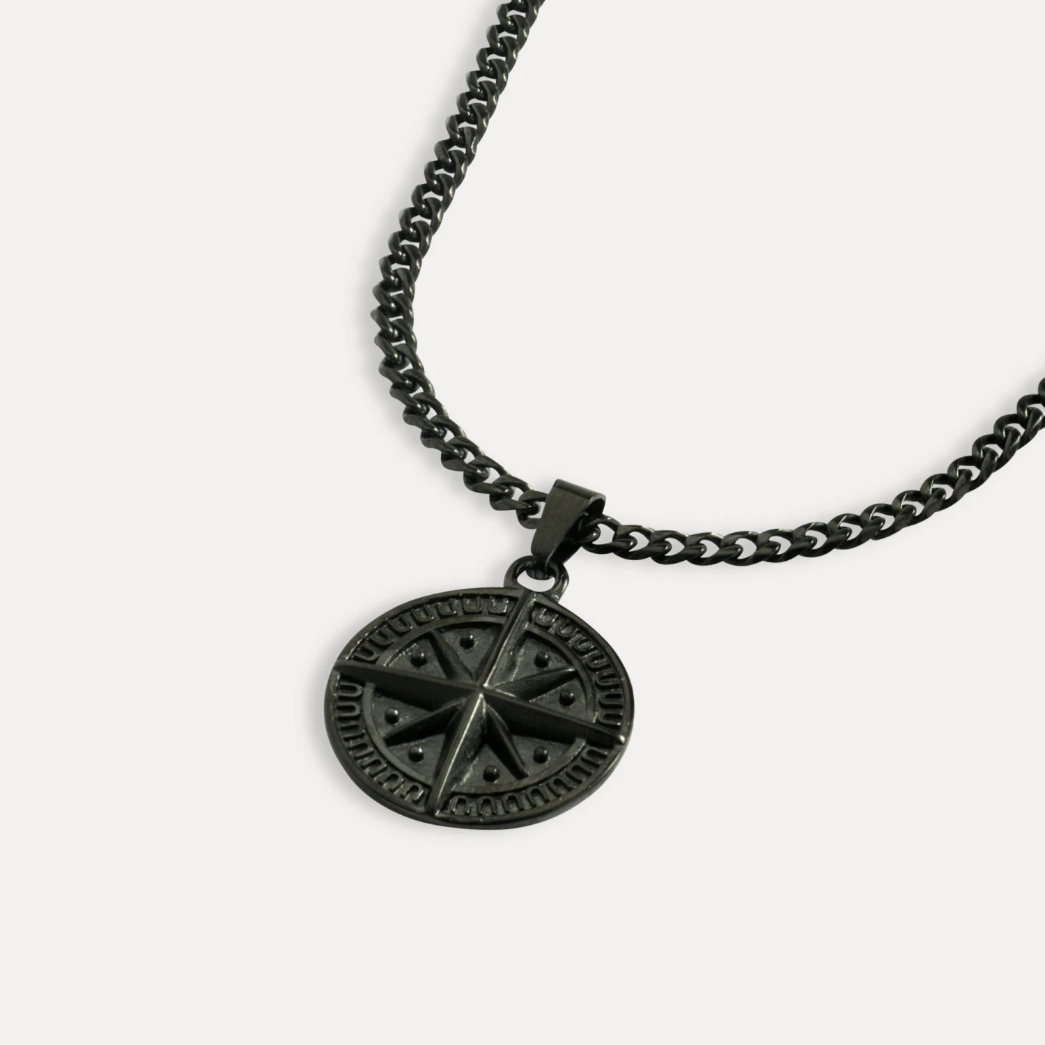Featuring a detailed Black Compass pendant Combined With a strong Cuban chain necklace. The Mens North Star Compass Necklace offers a simple yet masculine look, the perfect Necklace for your everyday style.