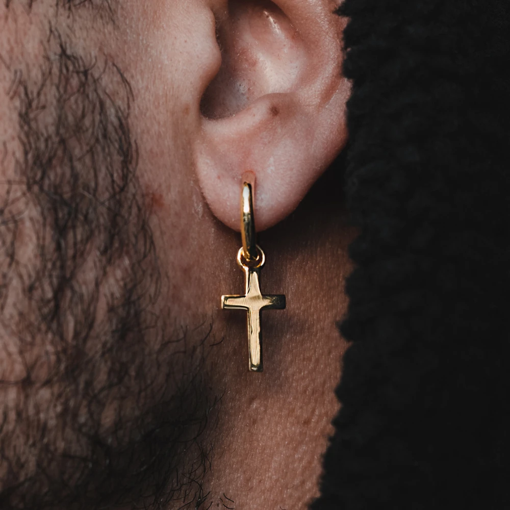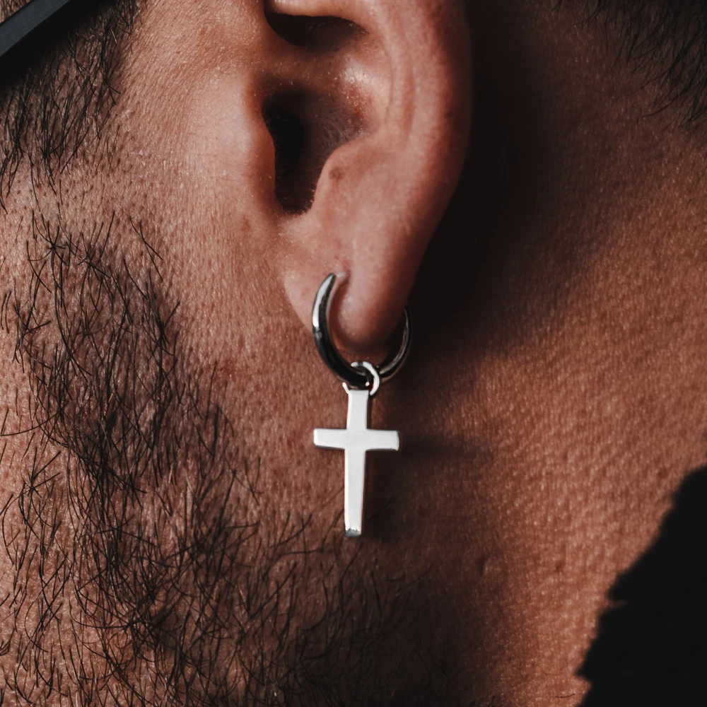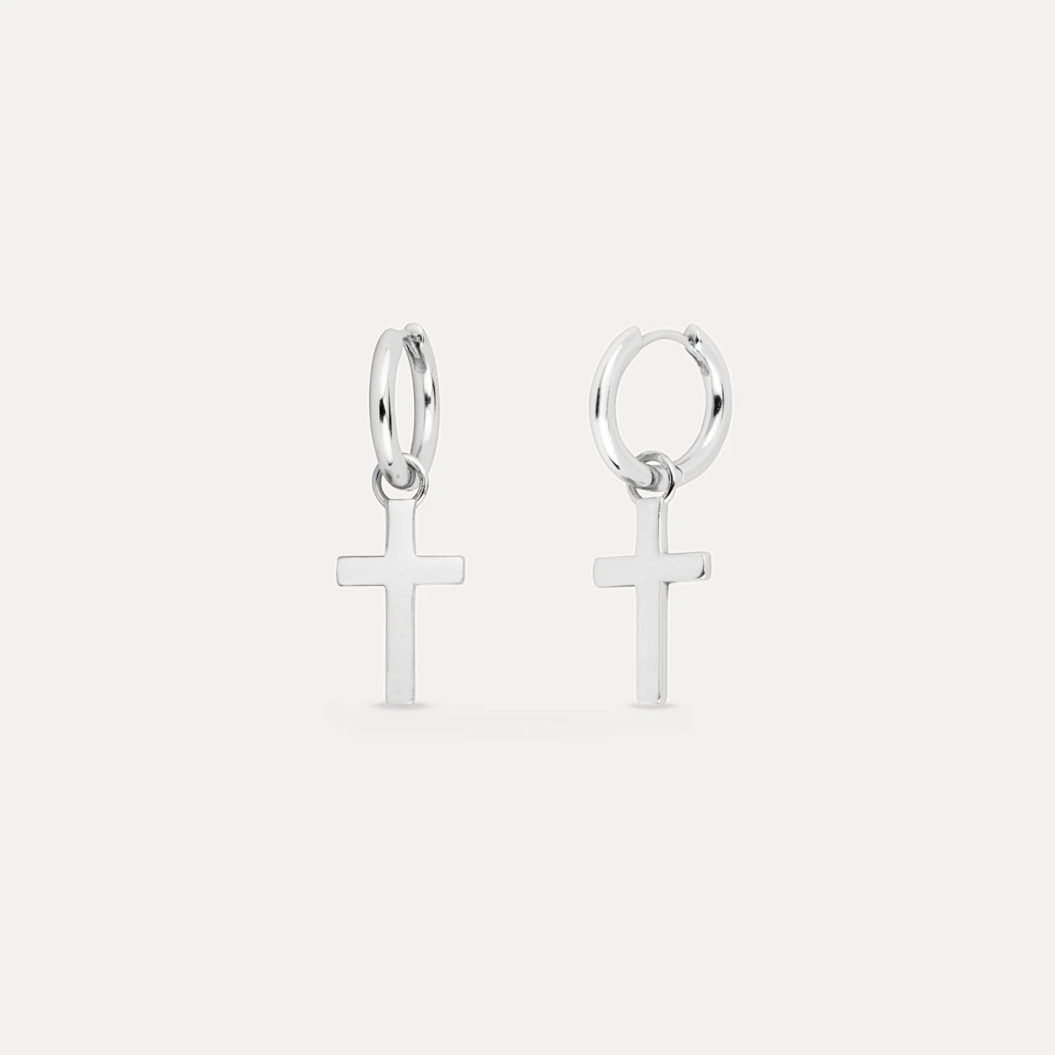 Introducing The Silver Cross Dangle Earring. Made from 925 Sterling Silver with a White Gold plating. Paired with a 15MM Silver Hoop earring giving you the option of wearing without the cross.