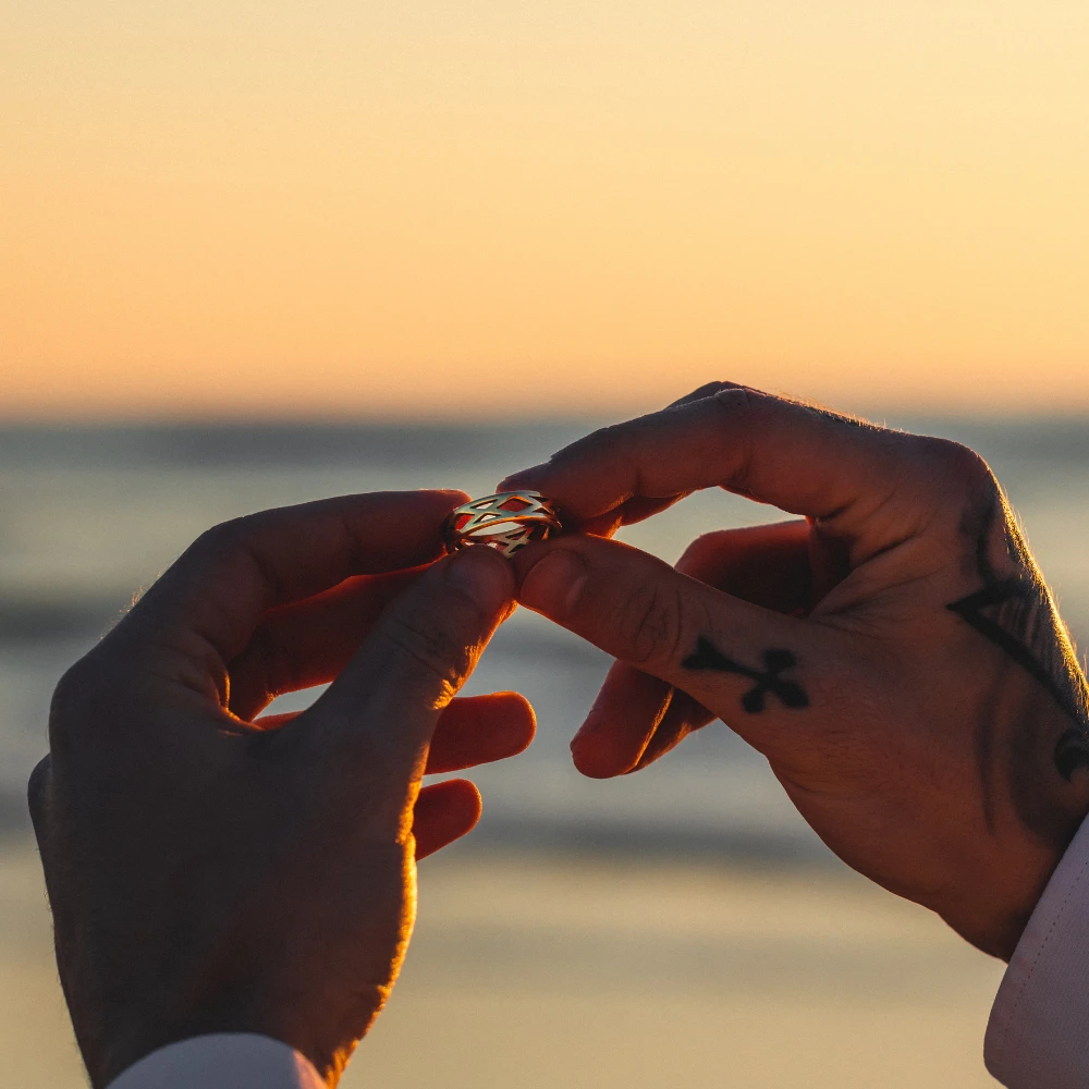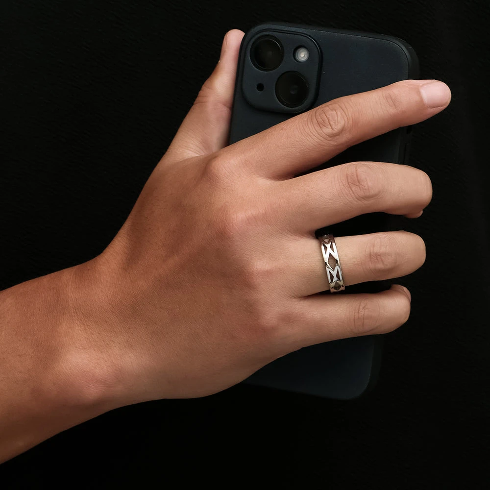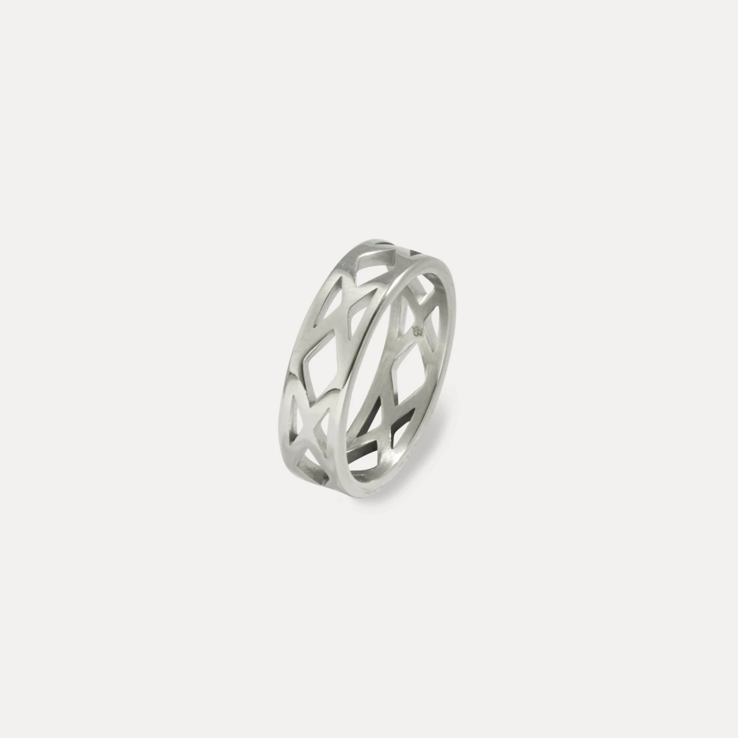 The edge ring. A hollow silver ring with a detailed pattern around the band. A quality band ring to pair with a thicker signet ring. Designed with our hoop earrings in mind and the same design is also available as a huggie earring!