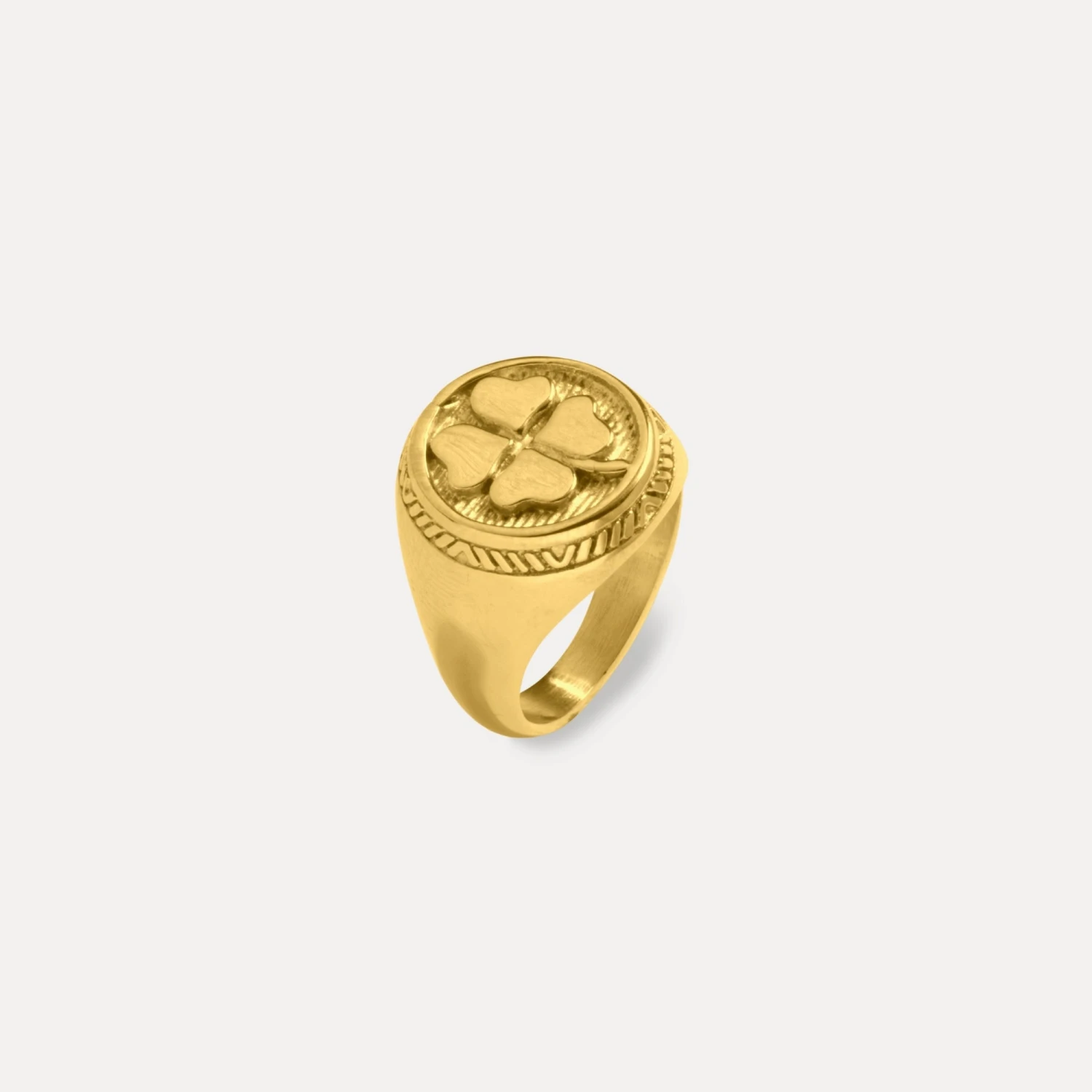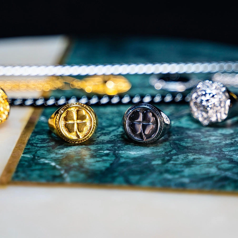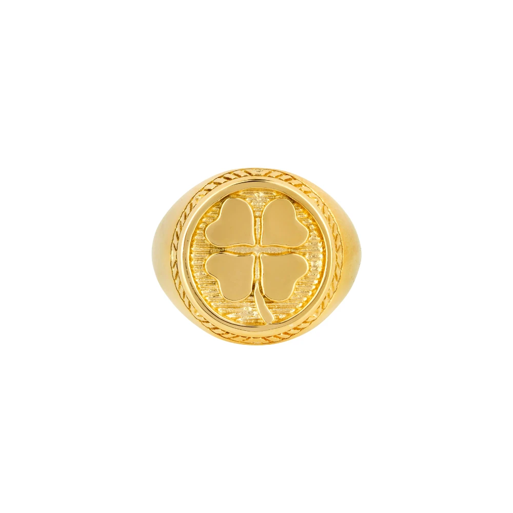 Simple engraved 4 Leaf Clover with greek key inspired pattern around the edge.