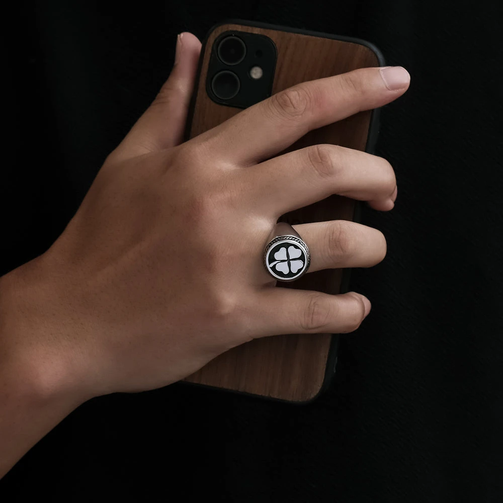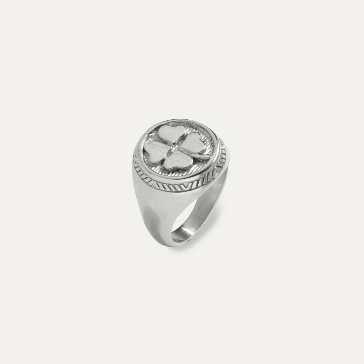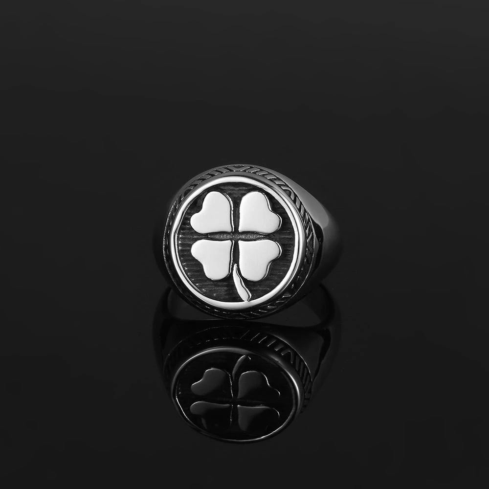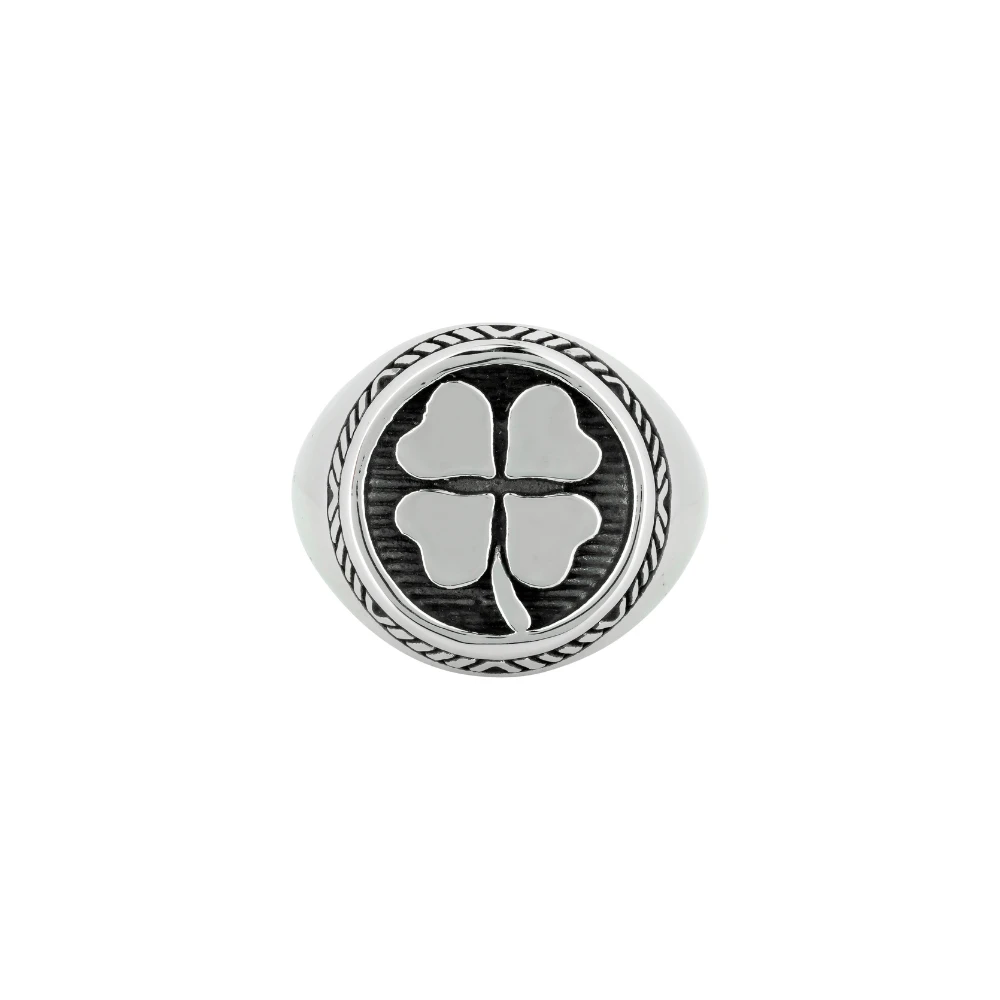 Simple engraved 4 Leaf Clover with greek key inspired pattern around the edge.