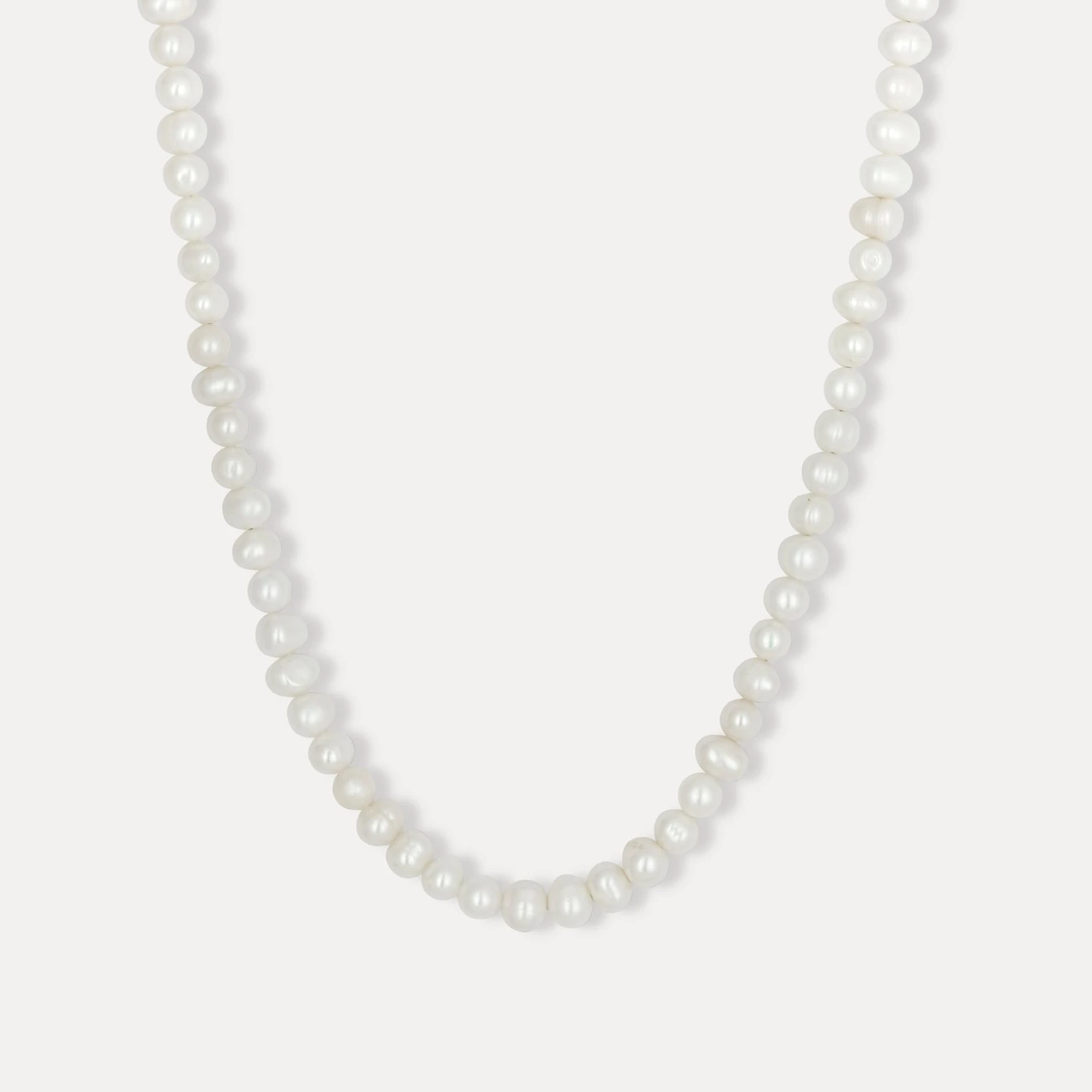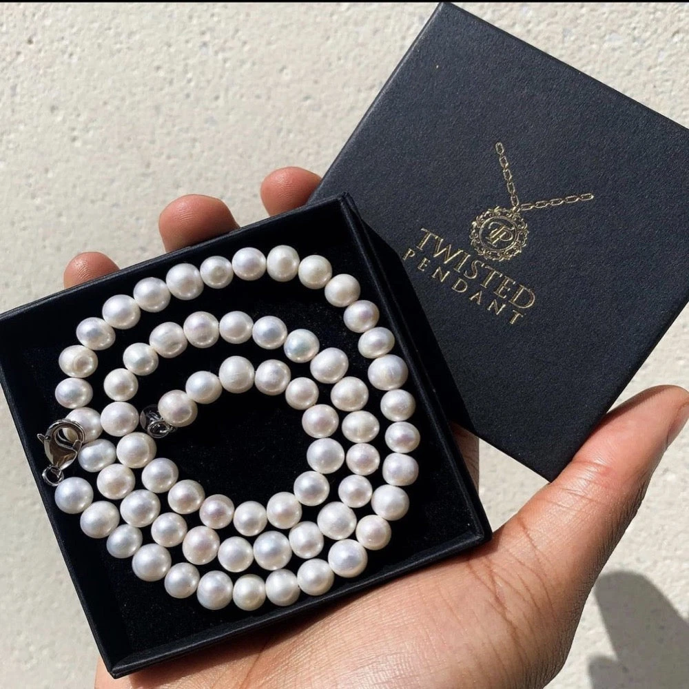 Individually strung Freshwater Pearl Necklace. Approximately 8mm Thick Pearls Combined with stainless Steel. A Timeless, unisex piece. Perfectly complimenting out your outfit all year round.