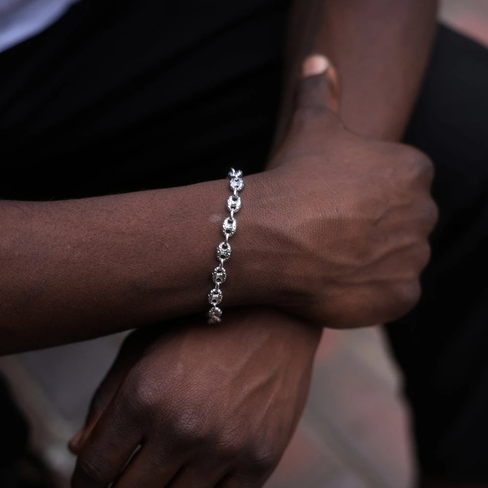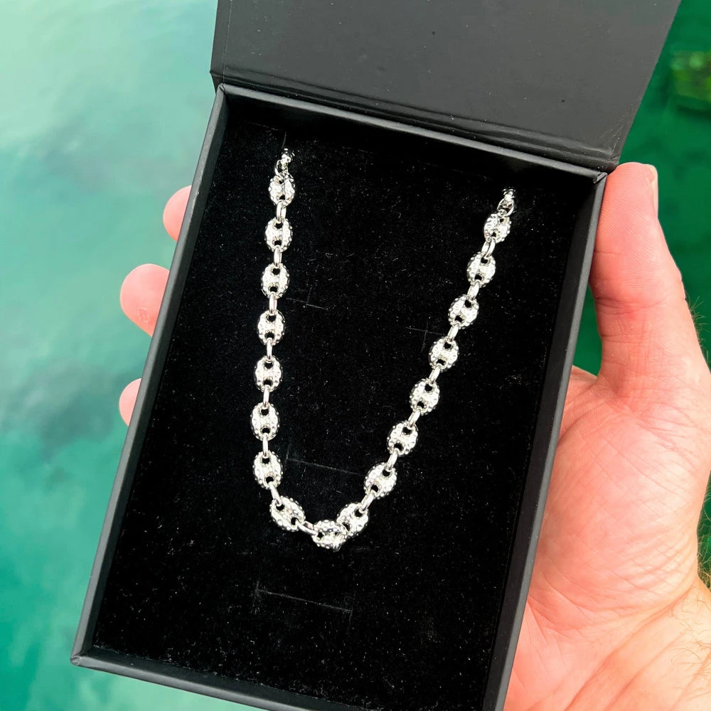 This chain is made from Recycled Stainless Steel (Surgical Grade 316L). This chain will not tarnish, rust or turn your skin green. Safe to wear in water & is more durable than other materials commonly used such as Silver & Gold.
