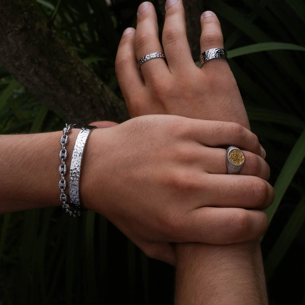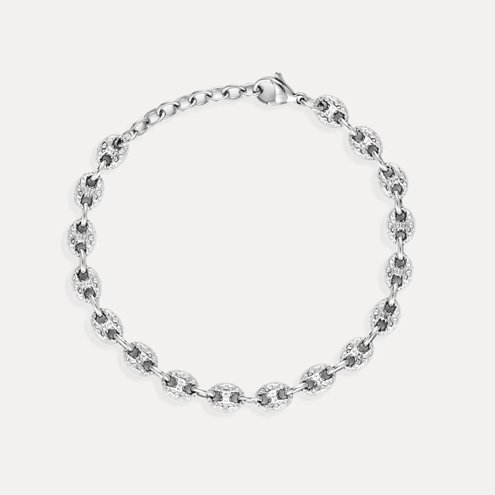 A piece made for summer! Hammered texture with chunky coffee bean styled links. Pairs well with any rings and bracelets. The best combo: Hammered mariner & hammered cuff!