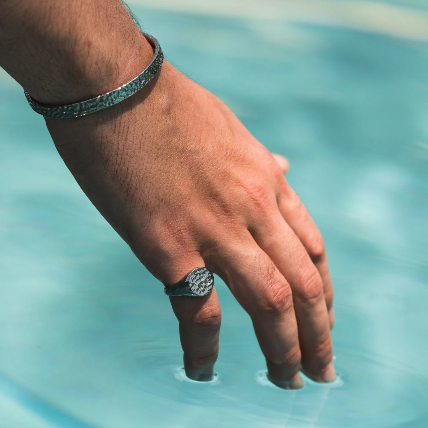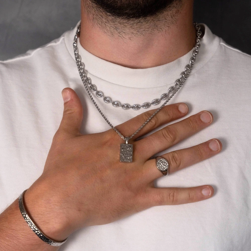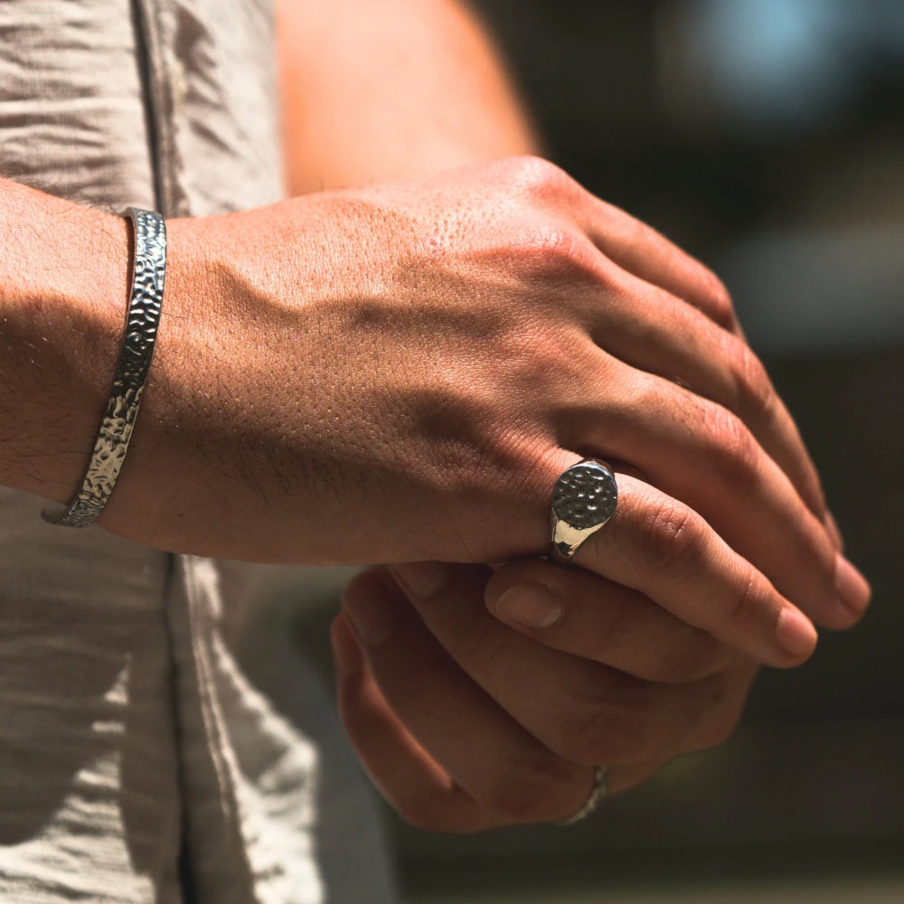 Hammered by design, it carries a raw, textured finish that catches the light without being loud. Simple & rugged. Easy to wear, it’s a piece that doesn’t try too hard, but always gets noticed.