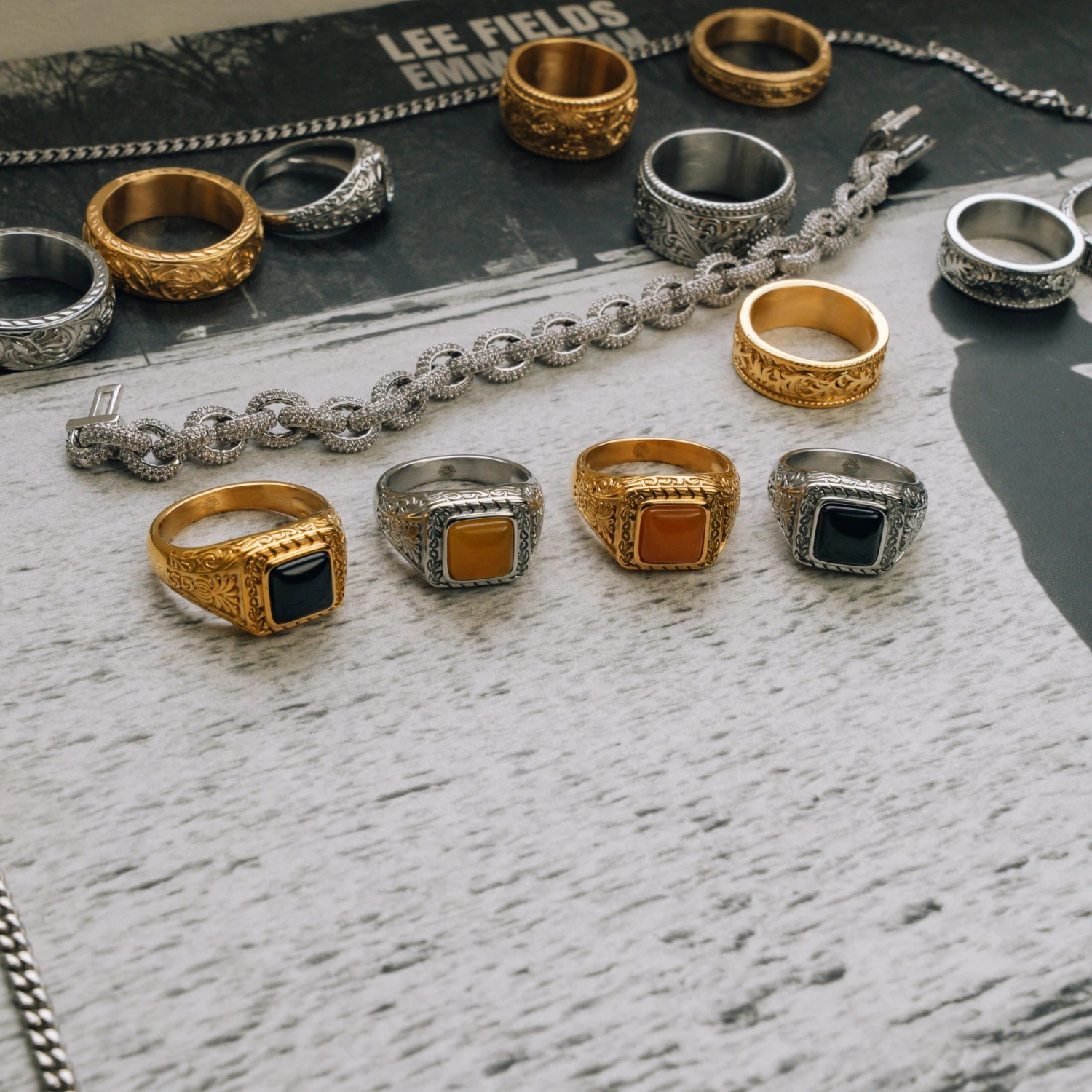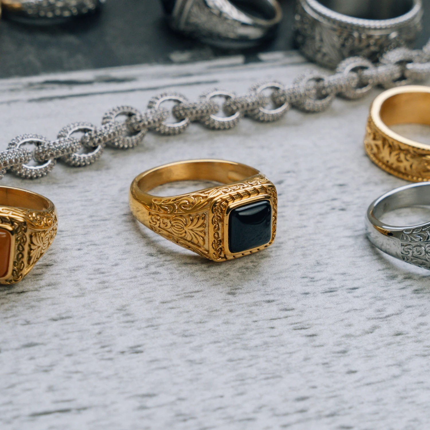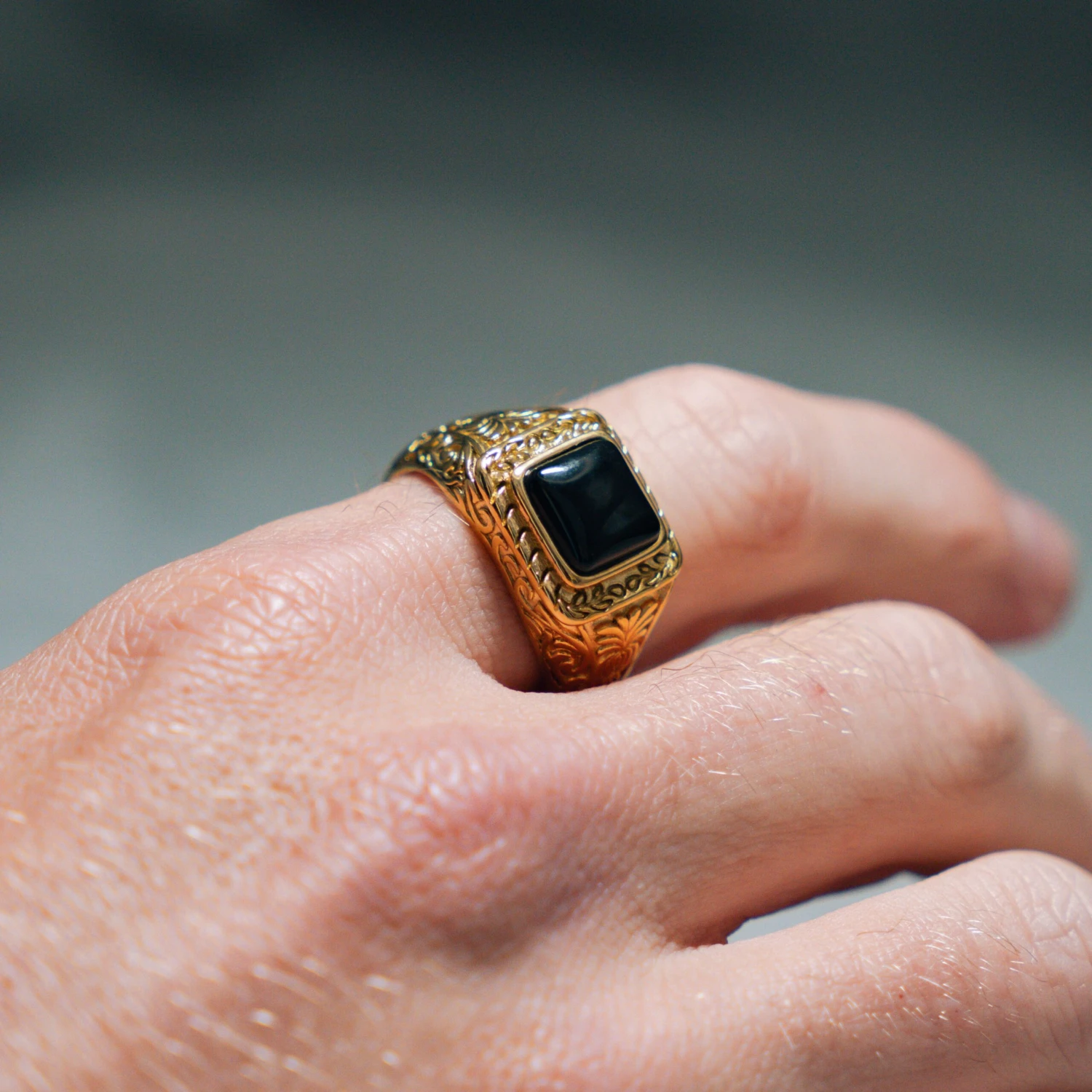 Set with a dark black gemstone framed by an ornate, intricate pattern on the gold band.