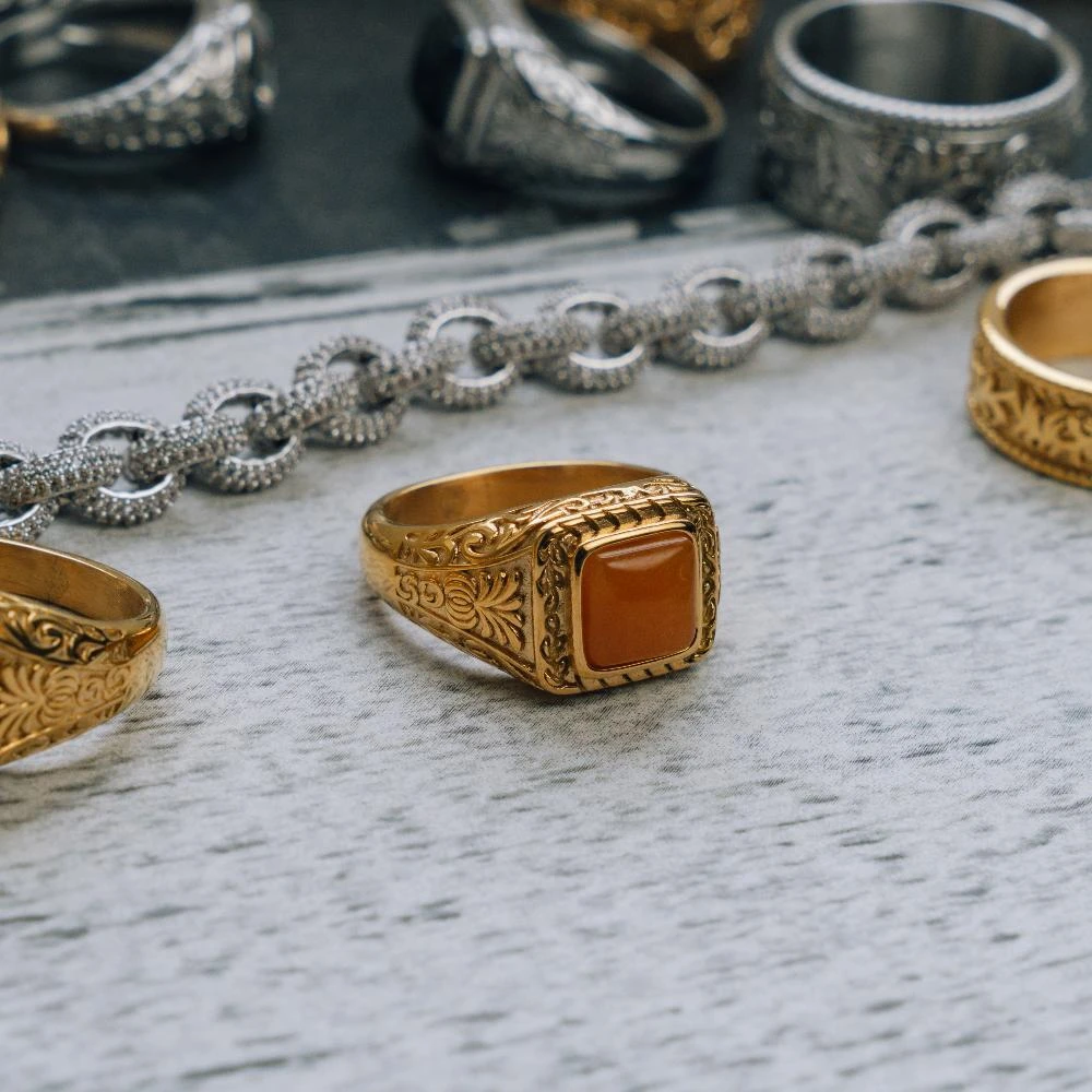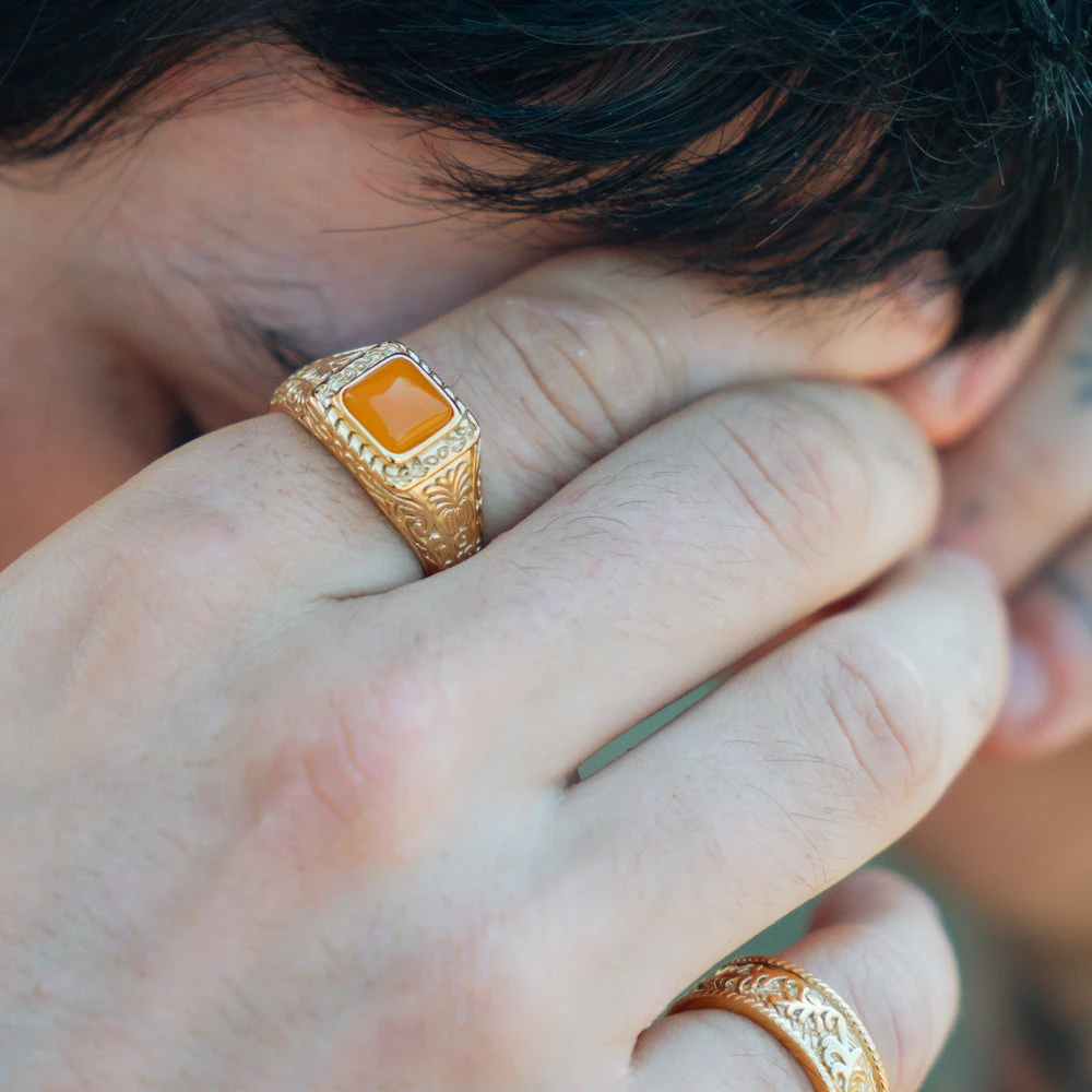 Set with a bright orange gemstone framed by an ornate, intricate pattern on the gold band.