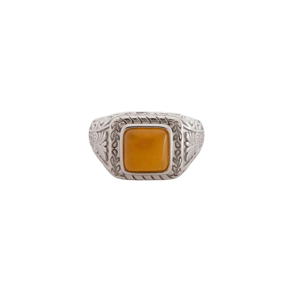 Set with a bright orange gemstone framed by an ornate, intricate pattern on the silver band.
