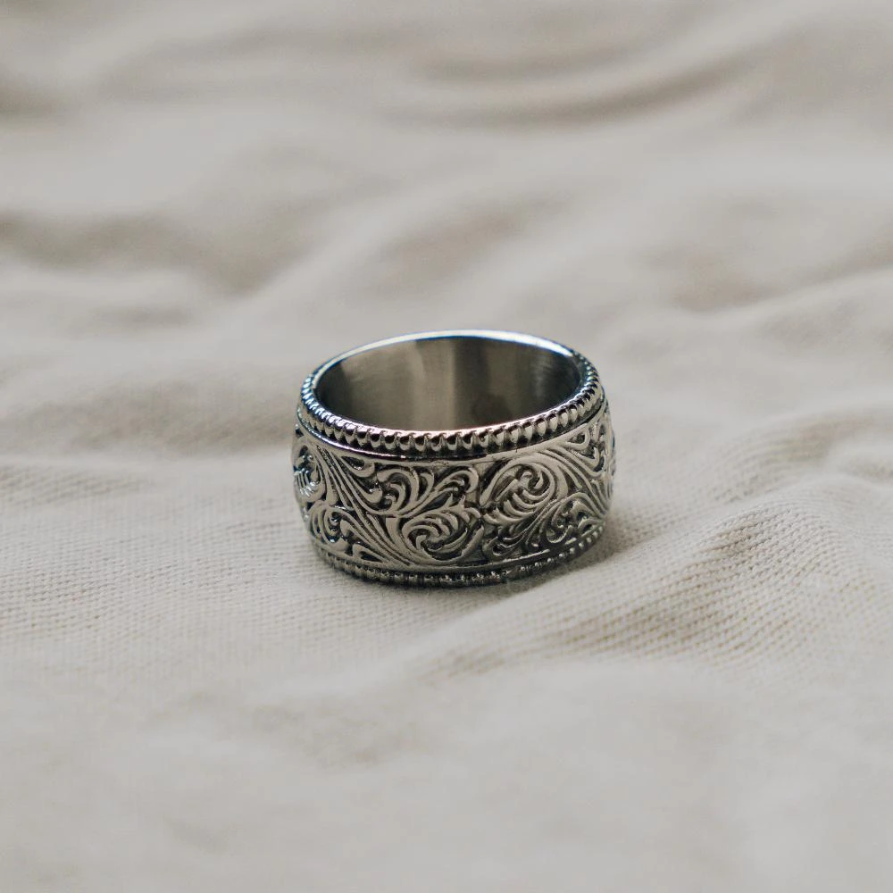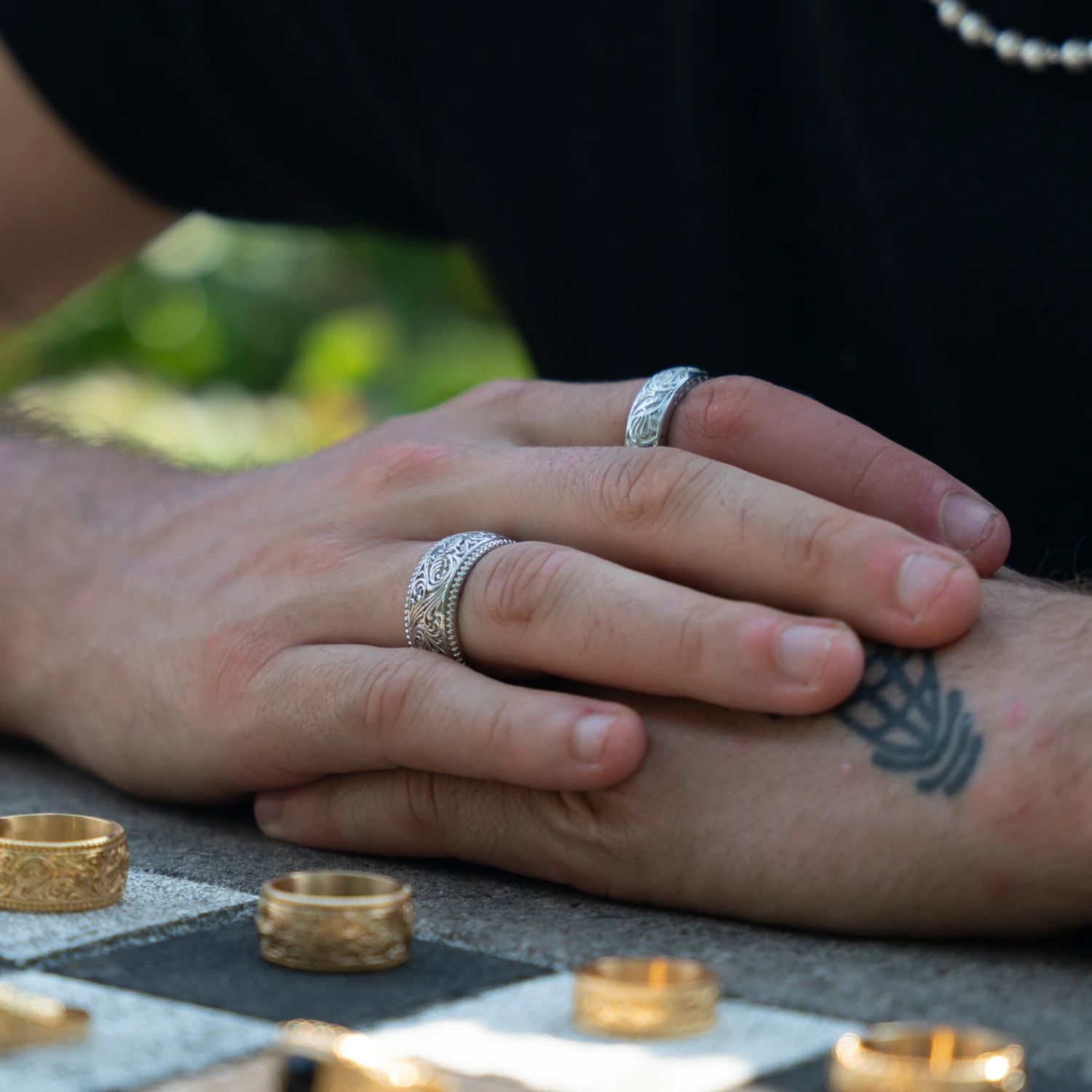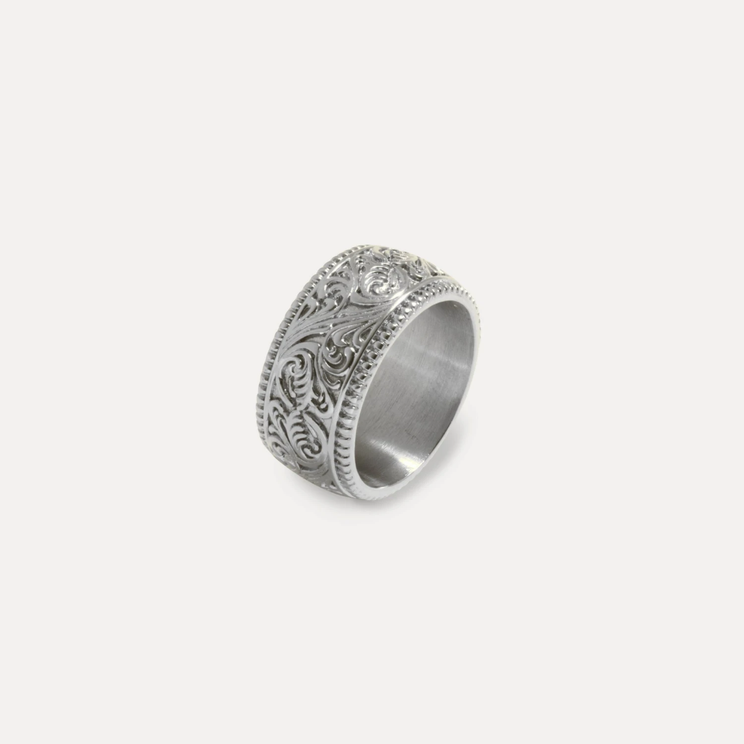 A masterfully crafted silver ring that embodies the art of intricate patterning, the Interlace Ring features a bold yet refined design of intertwining, engraved motifs.