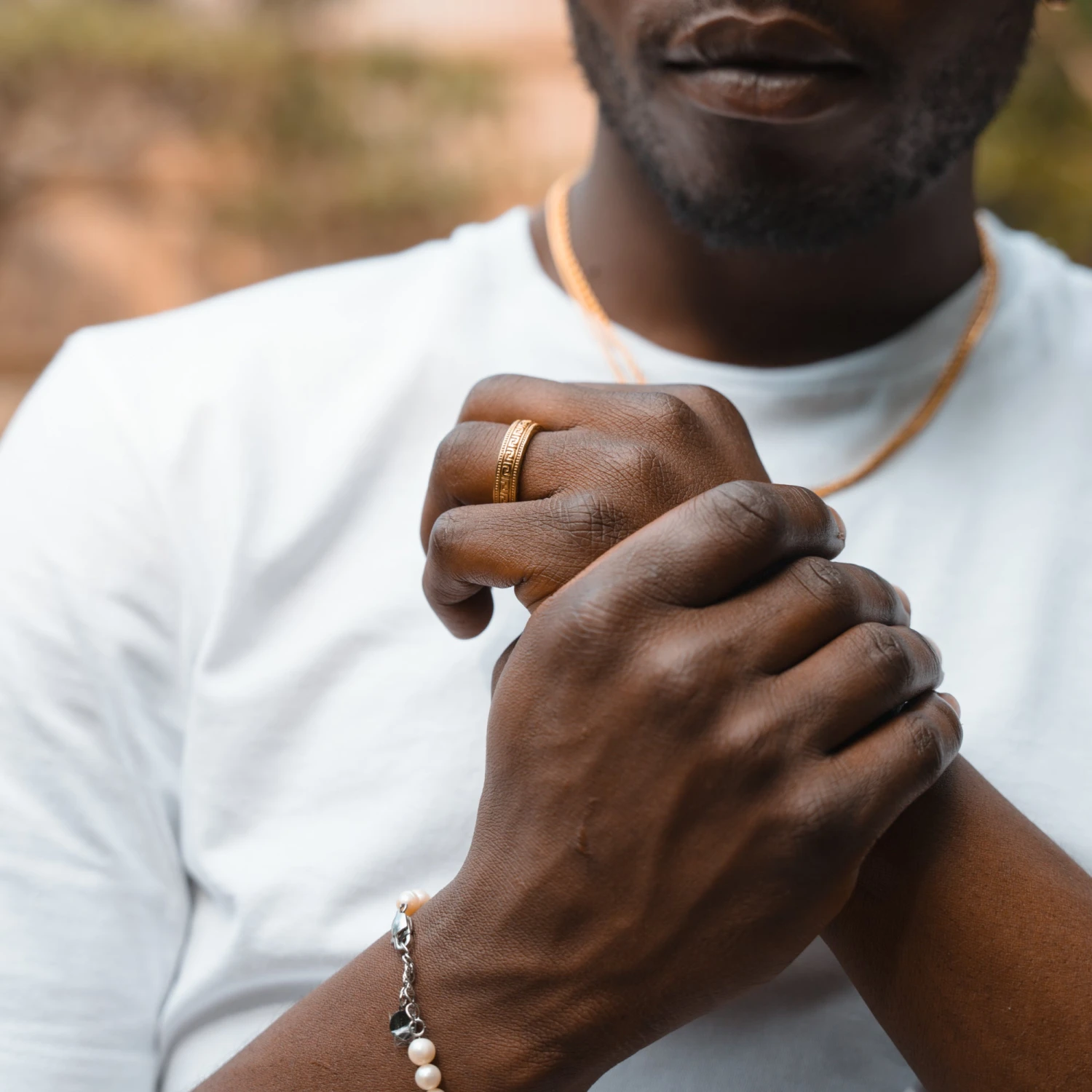 This ring is made from Recycled Stainless Steel (Surgical Grade 316L). This ring will not tarnish, rust or turn your skin green. Safe to wear in water & is more durable than other materials commonly used such as Silver & Gold.