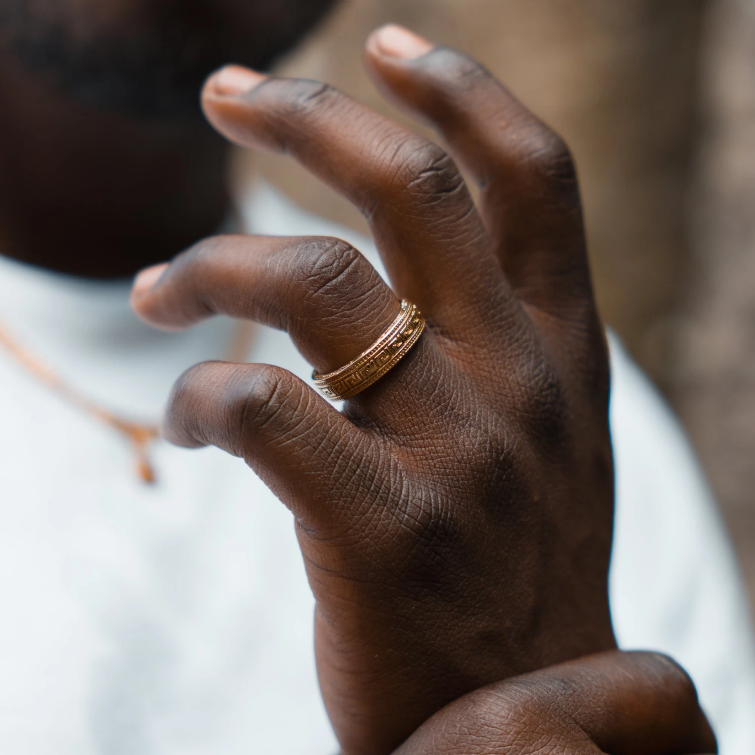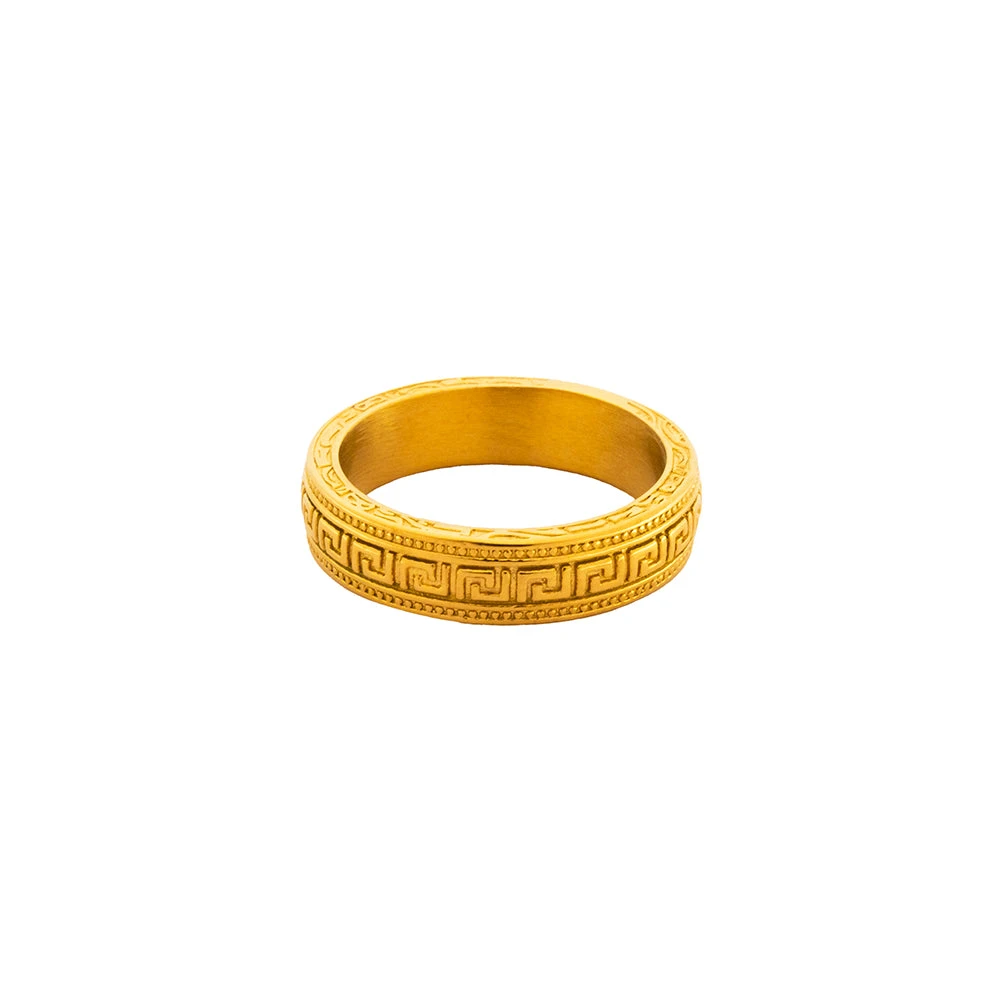 A Greek Key patterned band which is slightly raised to continue the pattern on the side of the ring.