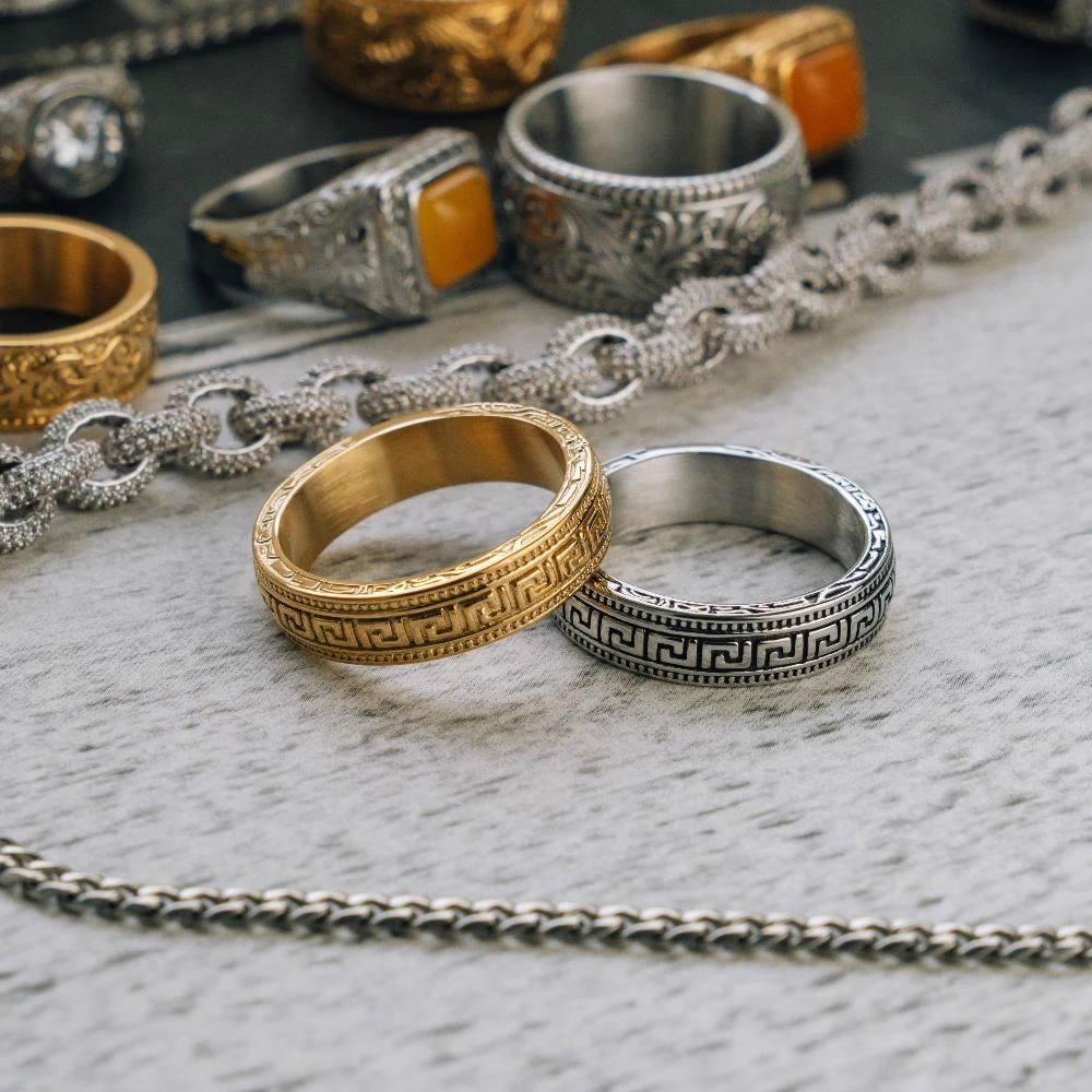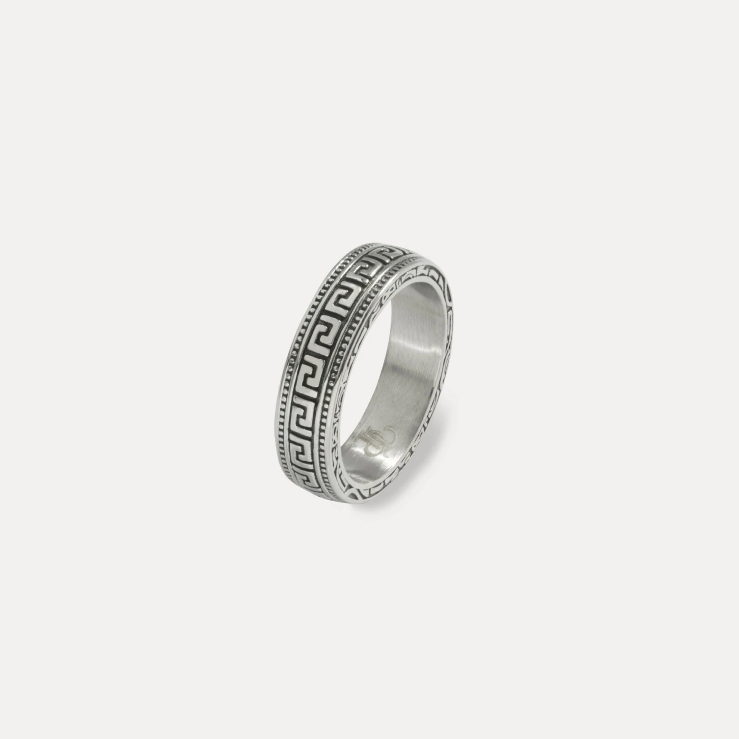 A Greek Key patterned band which is slightly raised to continue the pattern on the side of the ring.