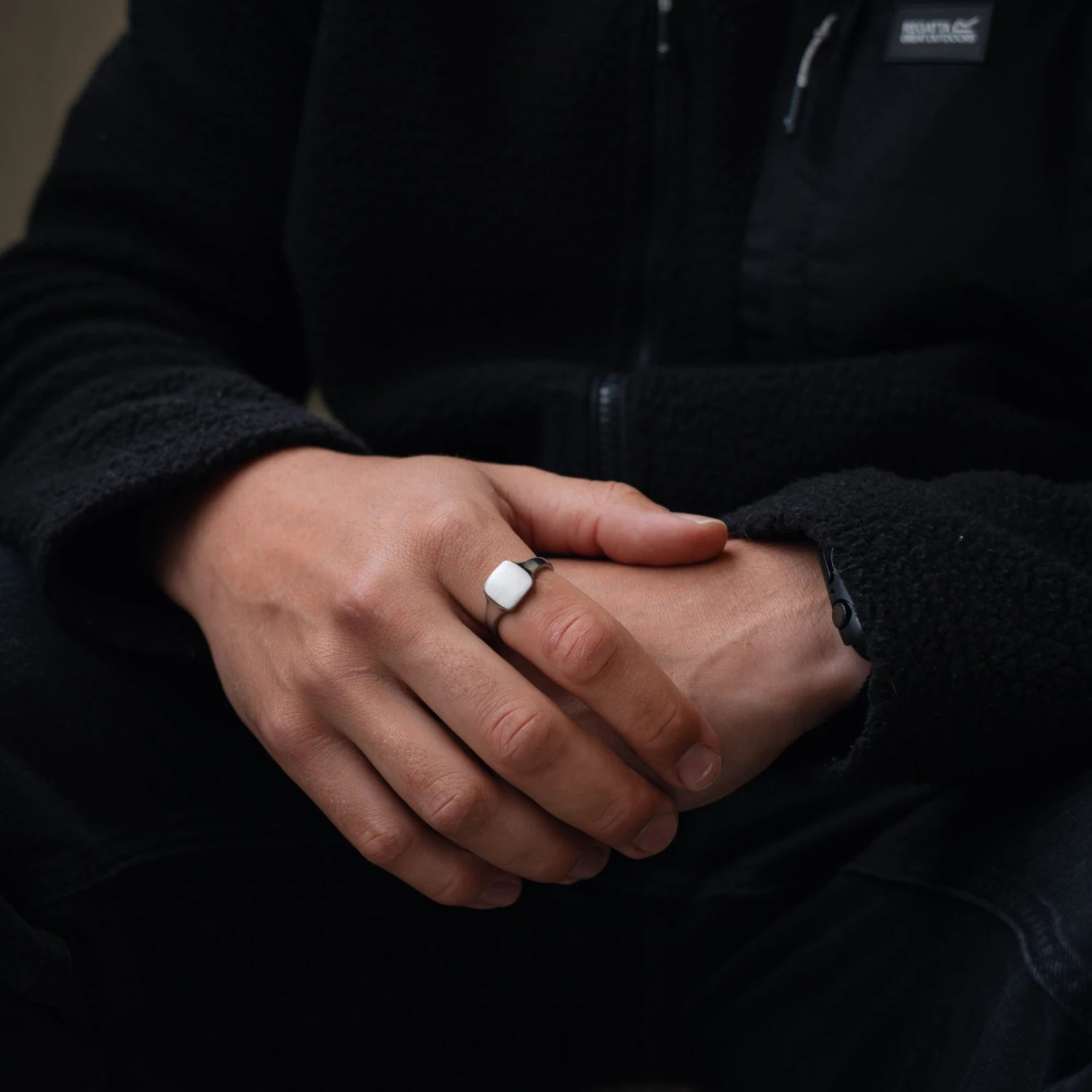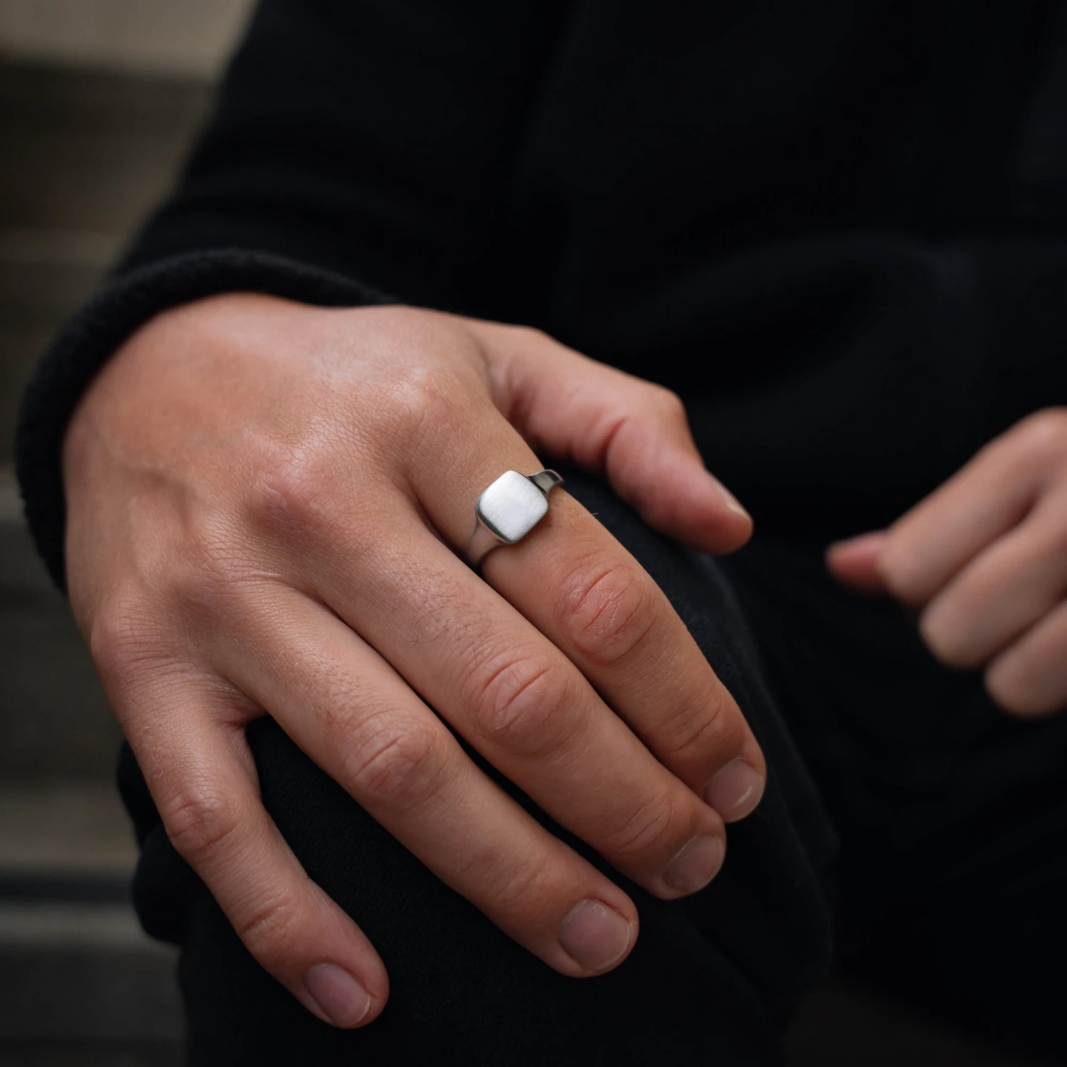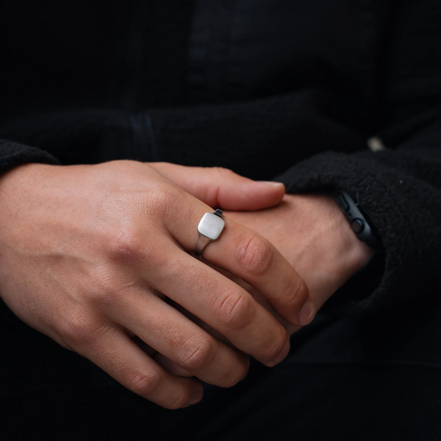 The Square matte signet ring, finished with a brushed finish for a minimalist toned down style with an extra protection against scratches.