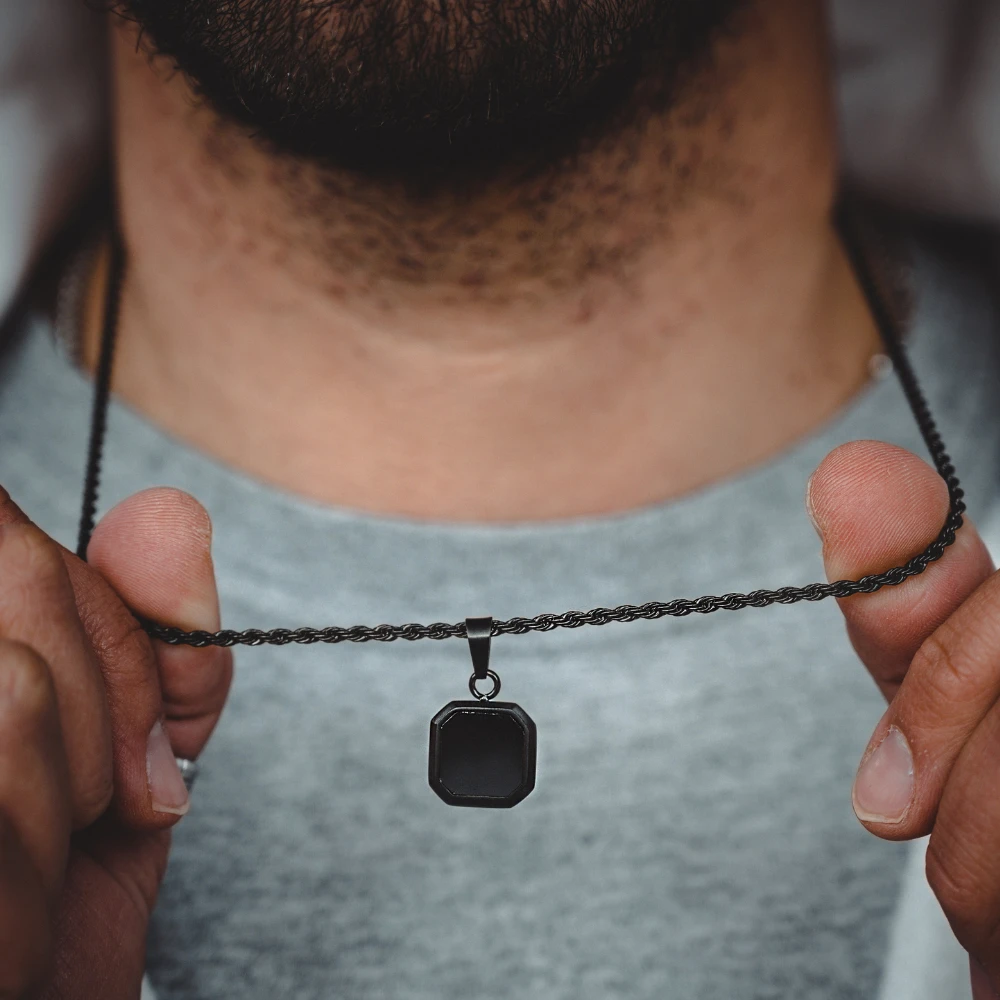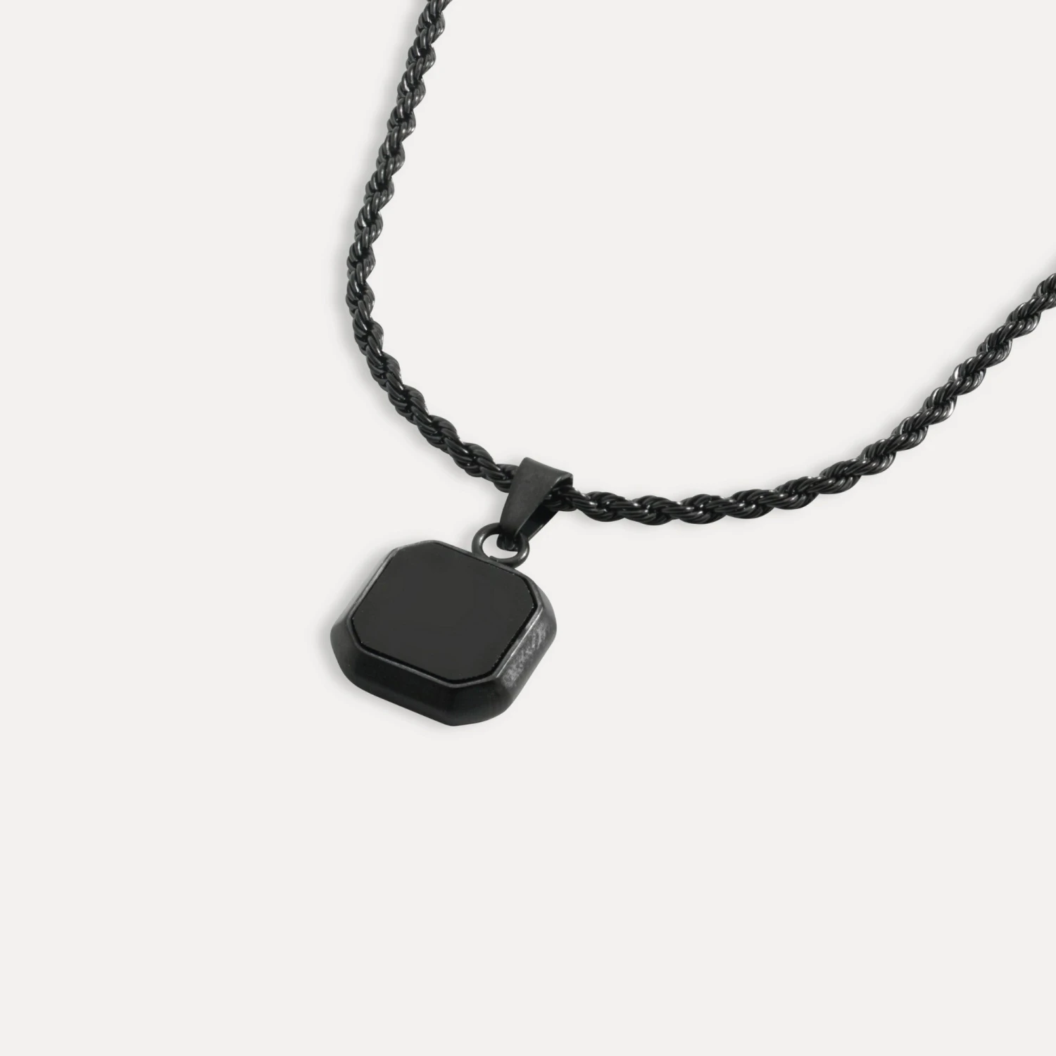 The Blacked out Onyx pendant. Created using real cuts of a black onyx stone. Every stone is unique making it the perfect necklace for your unique style.