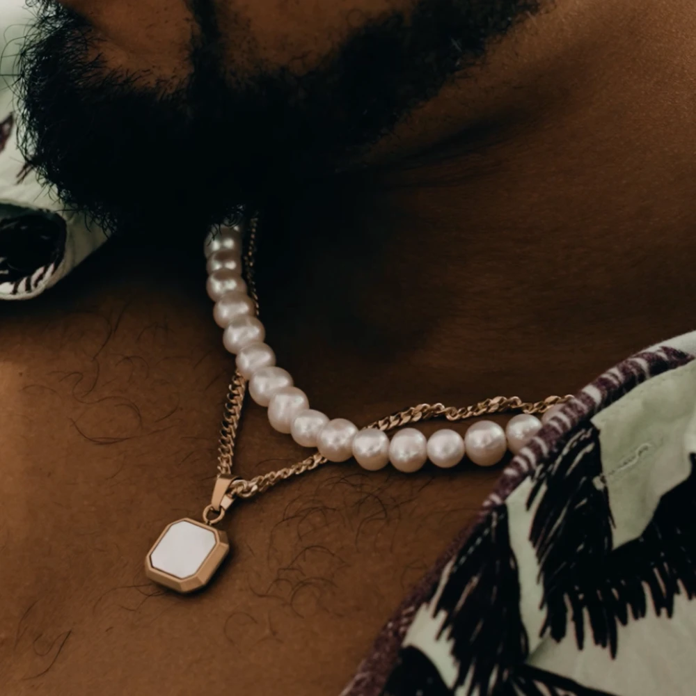 The Pearl finished stone pendant. Designed with our onyx stone pendant in mind; creating a pearl version of the loved Stone pendant! Available in Gold or Silver & perfect for layering – this is a classic unisex Jewellery piece.