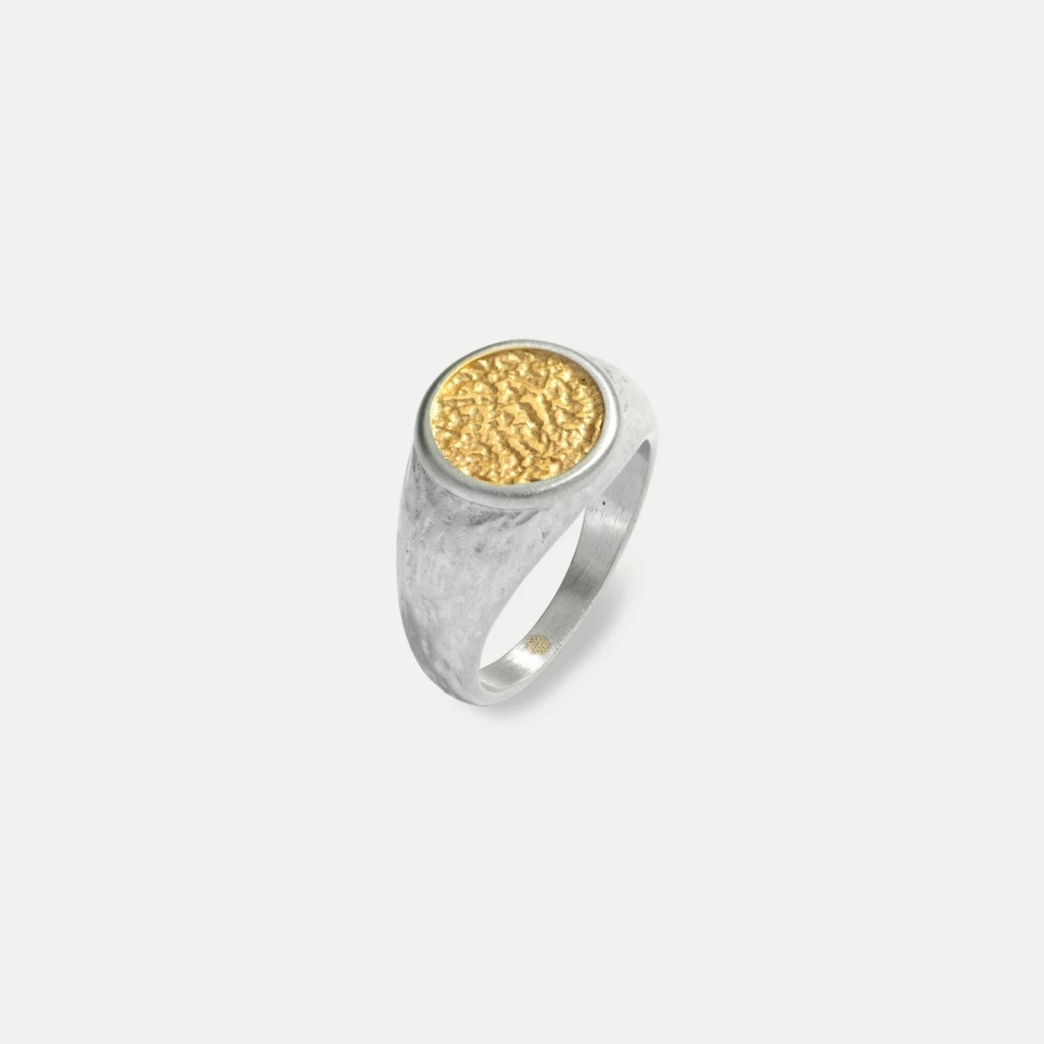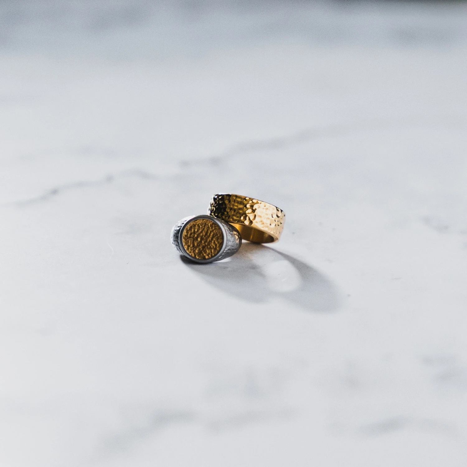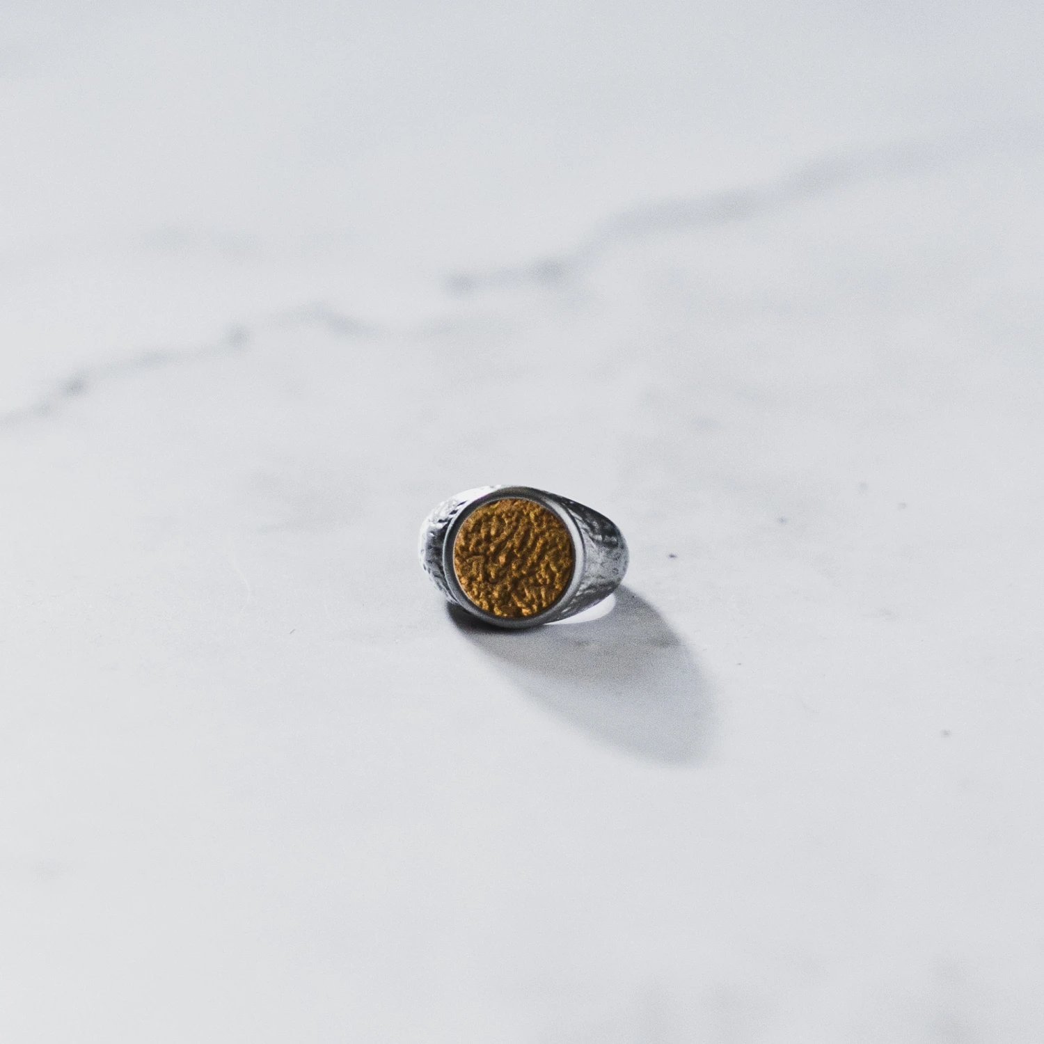 The Solaris Ring blends contrast and texture. Featuring a hammered silver body wrapped around a golden crater core. It feels like something uncovered, not created. Minimal yet powerful.