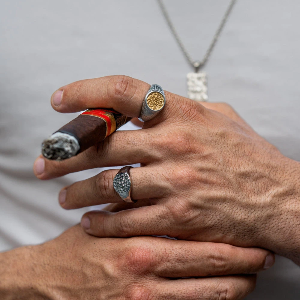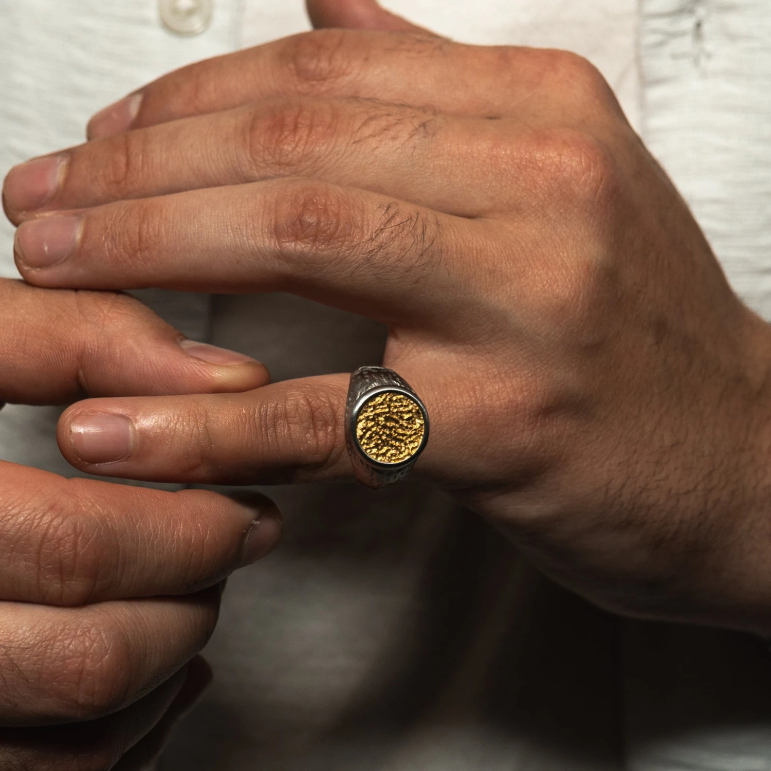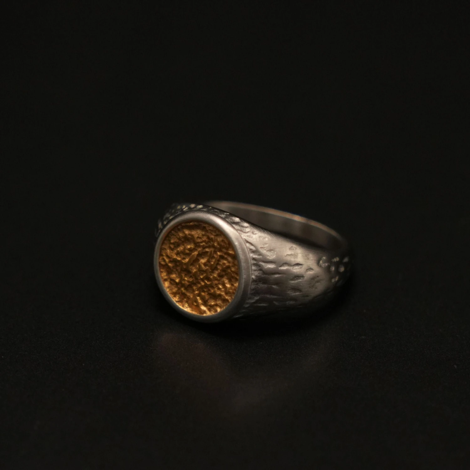 The Solaris Ring blends contrast and texture. Featuring a hammered silver body wrapped around a golden crater core. It feels like something uncovered, not created. Minimal yet powerful.