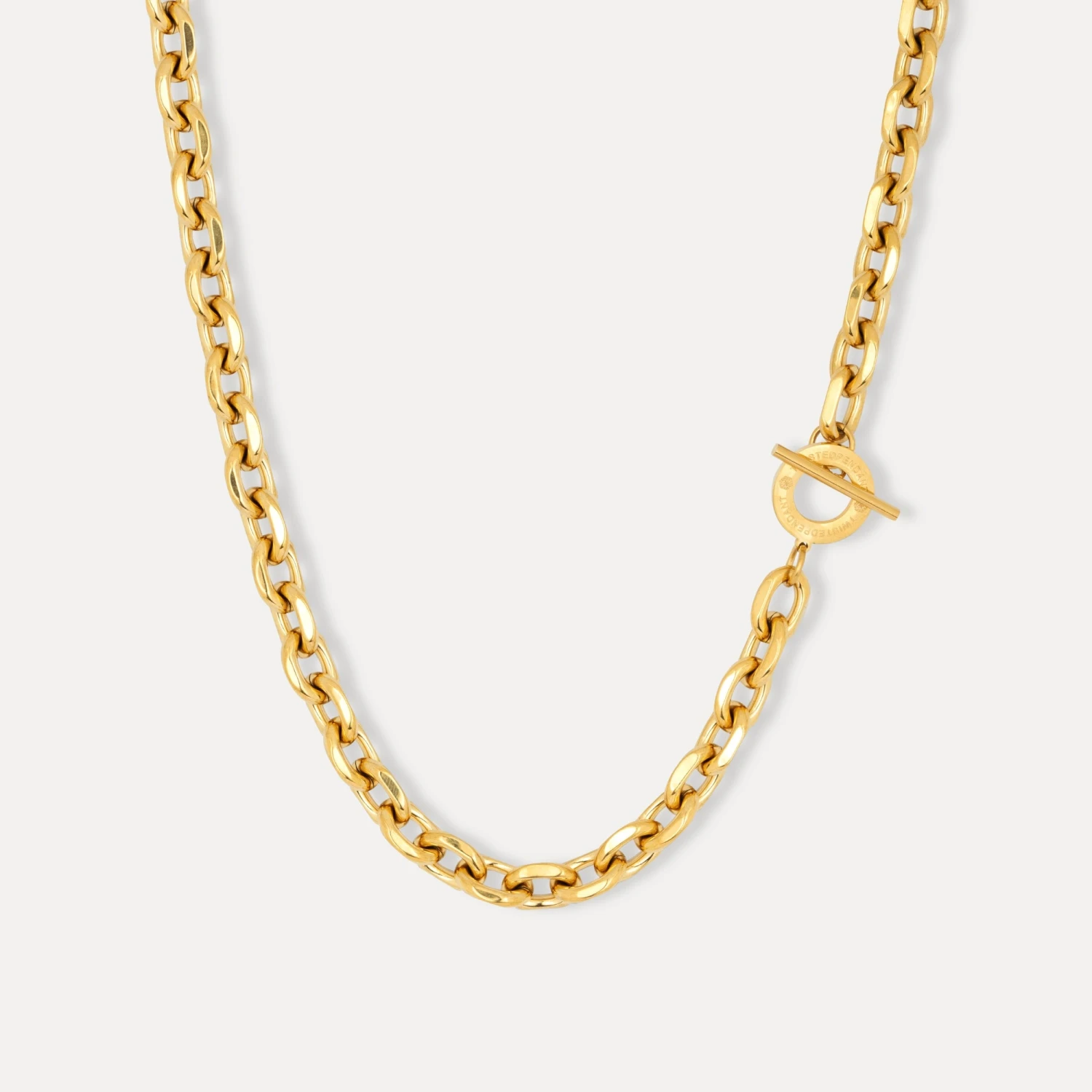 18K Gold Striker chain has chunky links and is complete with a toggle style closure. Finished with a polish finish which will keep you fresh all summer.