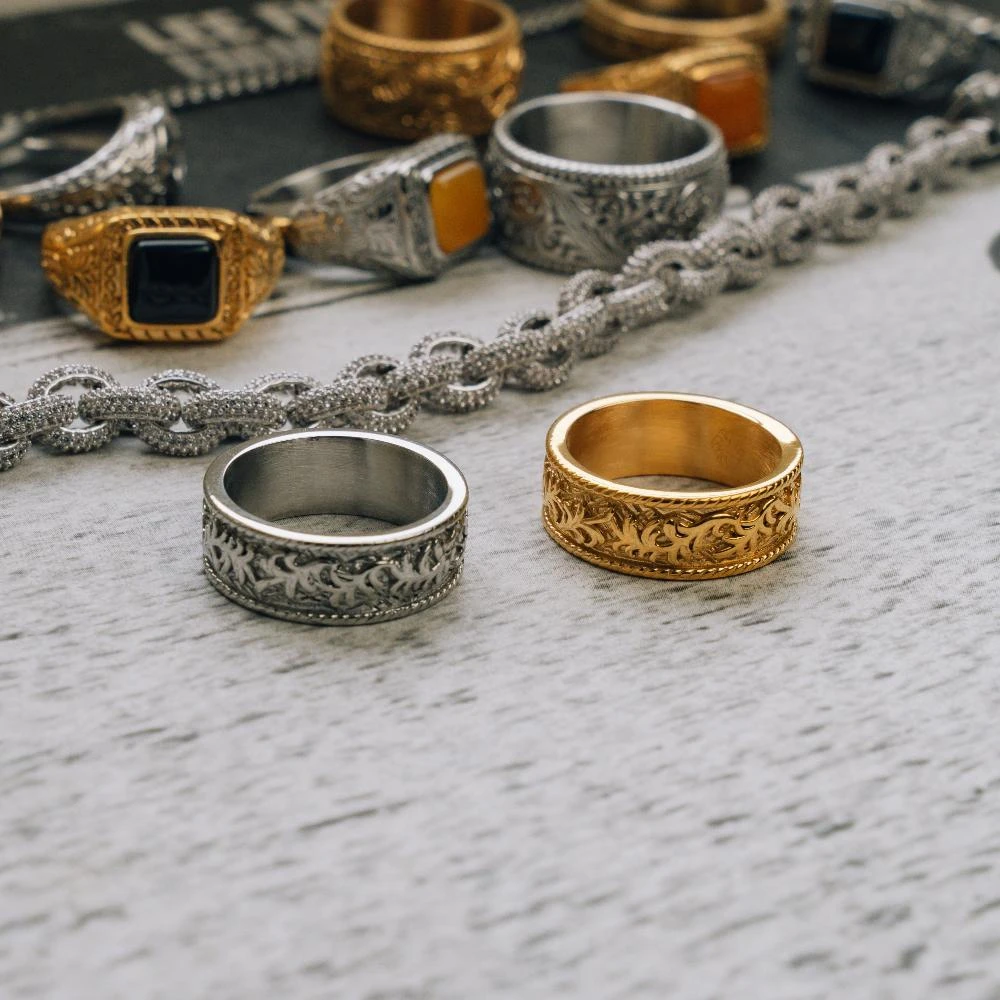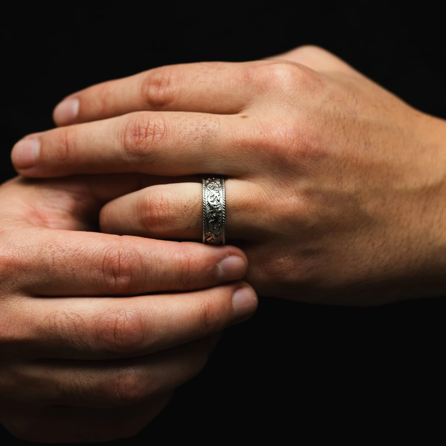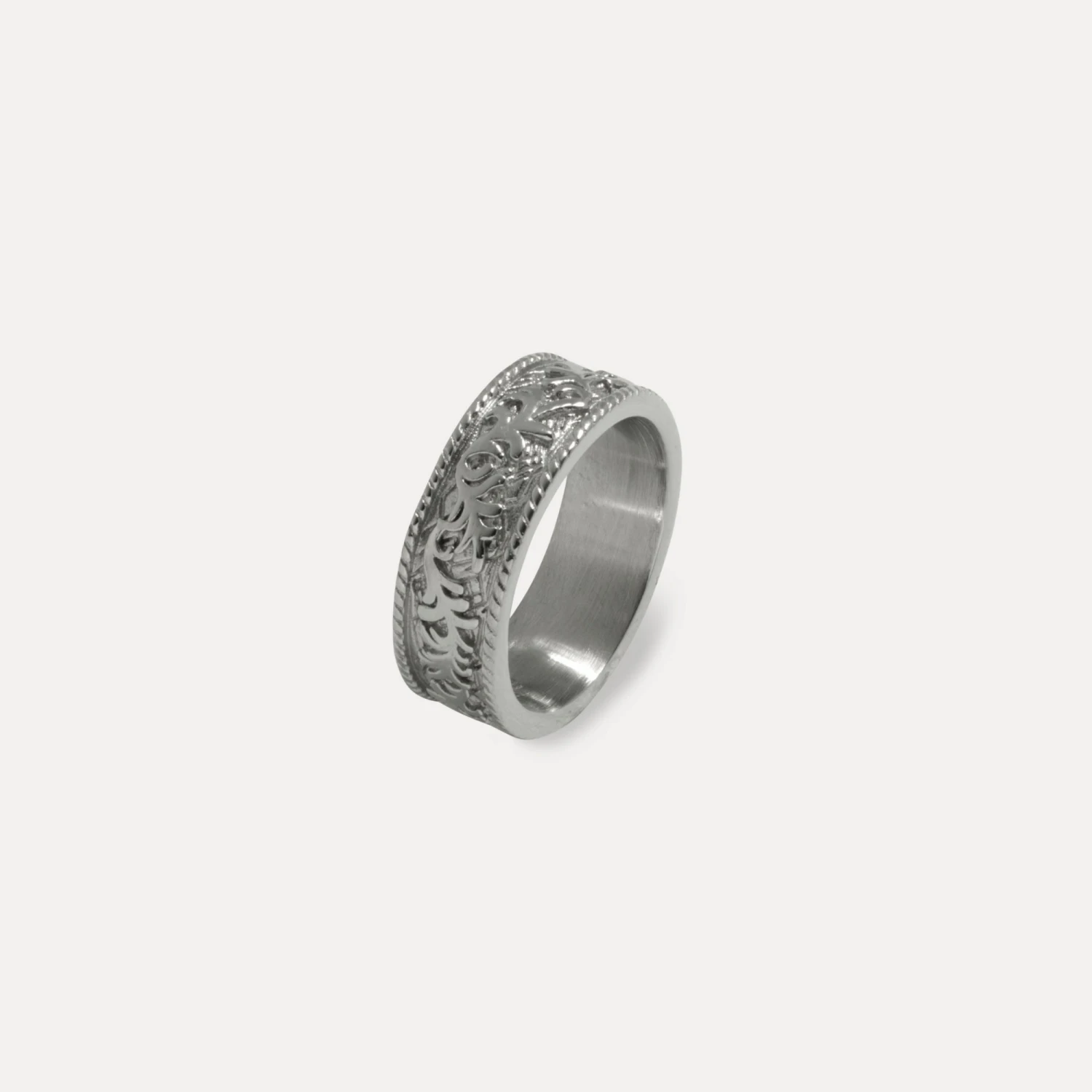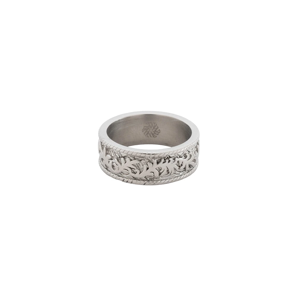 This ring has a wide band with a detailed, engraved pattern that wraps around its entire surface. The outer edges of the ring have a textured border, which frames the central pattern.