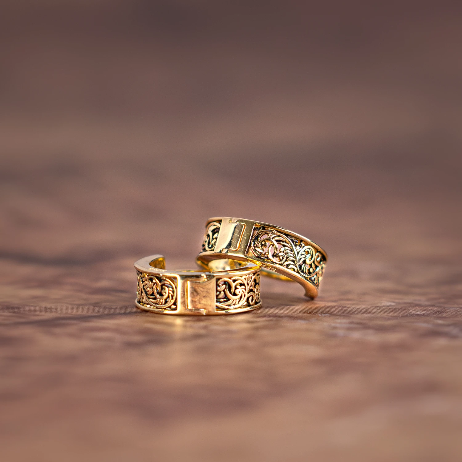 A thicker huggie style hoop earring with a classic pattern throughout.