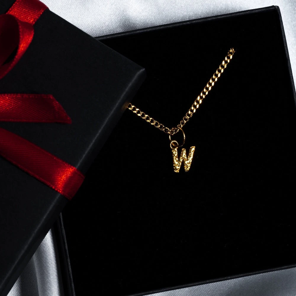 Our Micro Vintage Gold initial pendant. A hammered letter, available to add onto 2 different chain styles and thicknesses.
