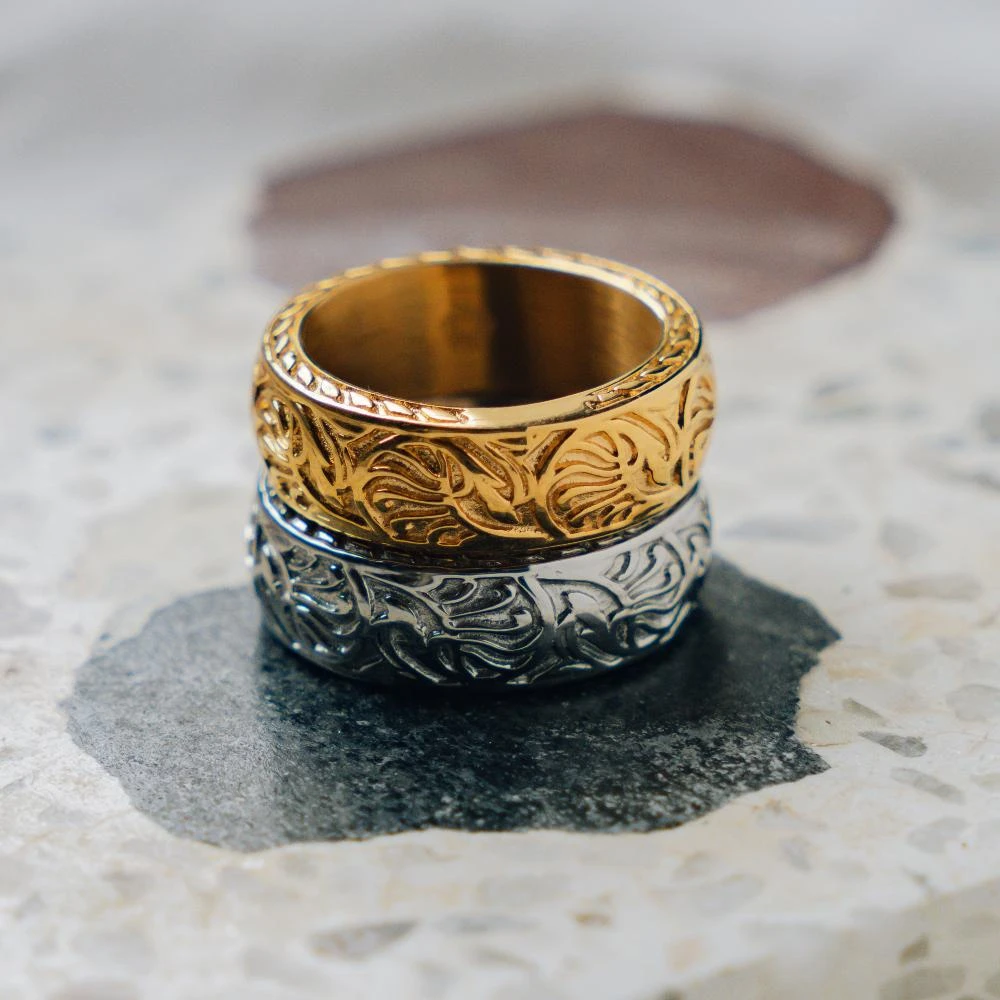 A chunky band with a continuous swirling pattern encompassing the whole ring. The sides of the band are raised emphasising the vortex style of the ring.