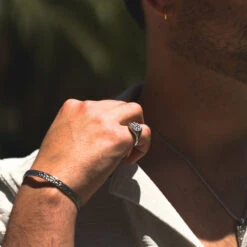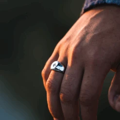 This ring is made from Recycled Stainless Steel (Surgical Grade 316L). This ring will not tarnish, rust or turn your skin green. Safe to wear in water & is more durable than other materials commonly used such as Silver & Gold.