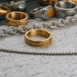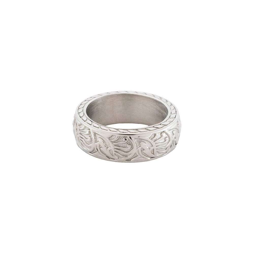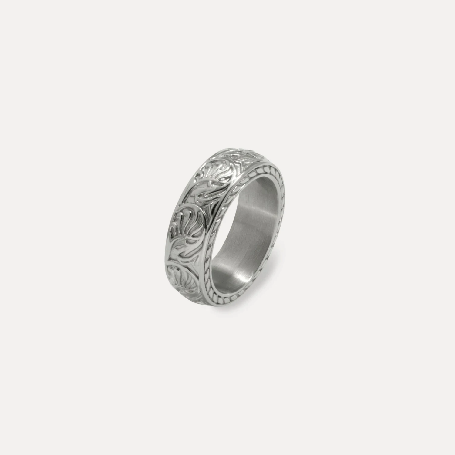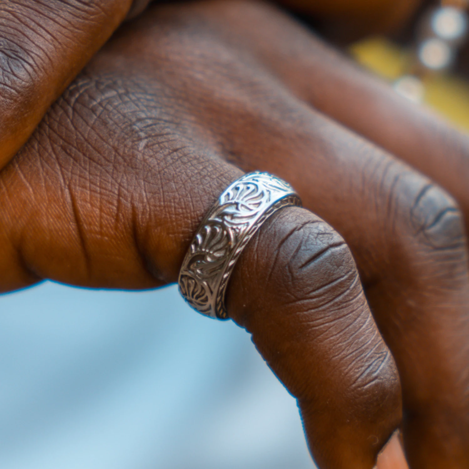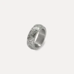 The Vortex ring. A chunky band with a continuous swirling pattern encompassing the whole ring. The sides of the band are raised emphasising the vortex style of the ring.